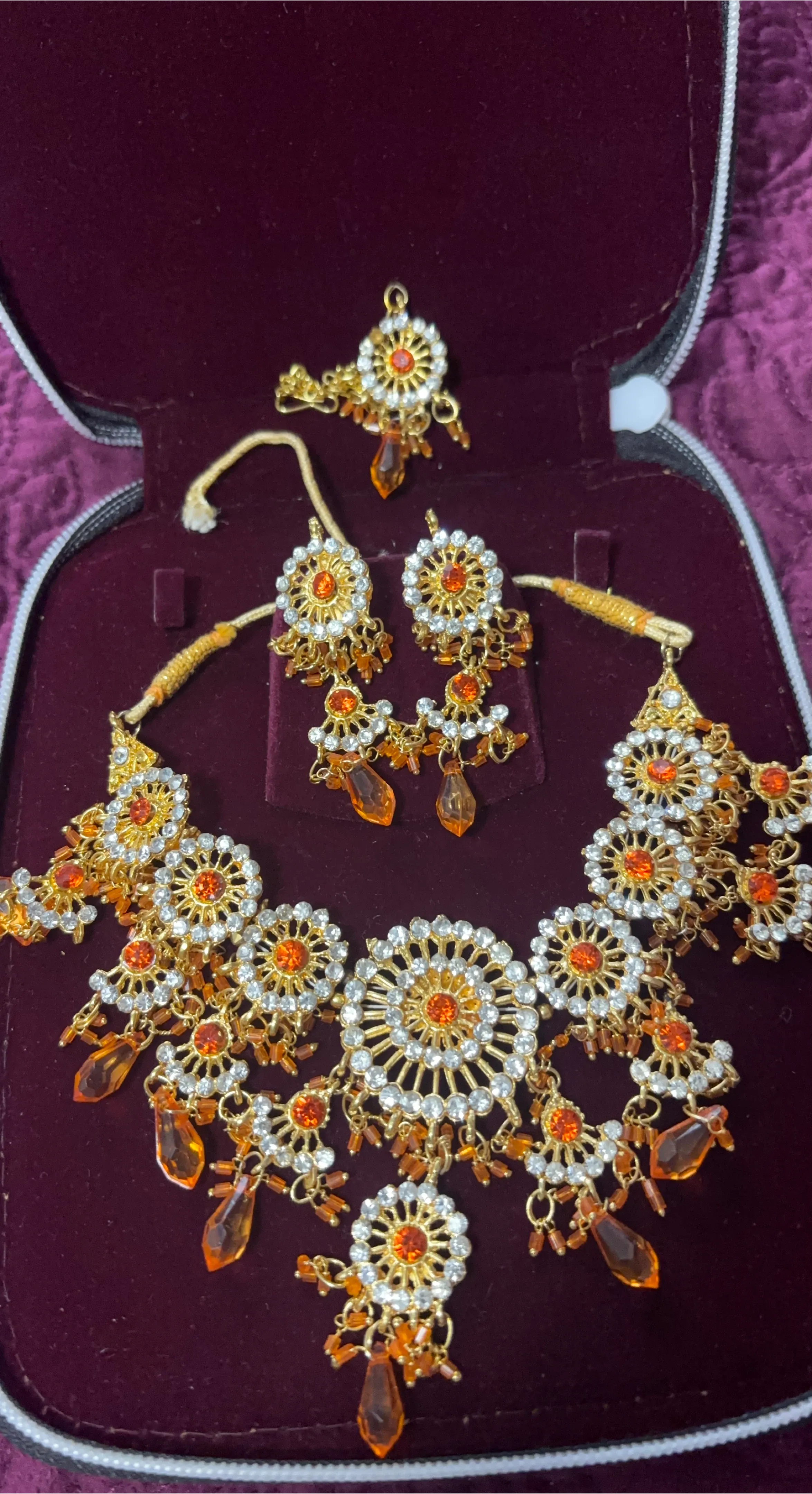 A beautiful jewellery set featuring a necklace and matching earrings. It's adorned with sparkling orange and clear stones, set in a gold-tone metal. This set is perfect for adding a pop of colour to any outfit!