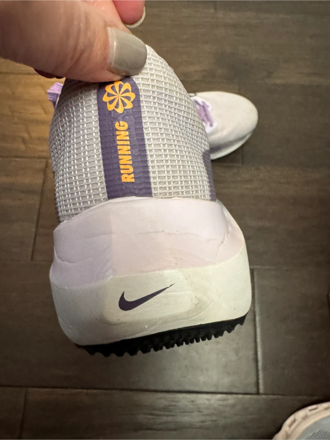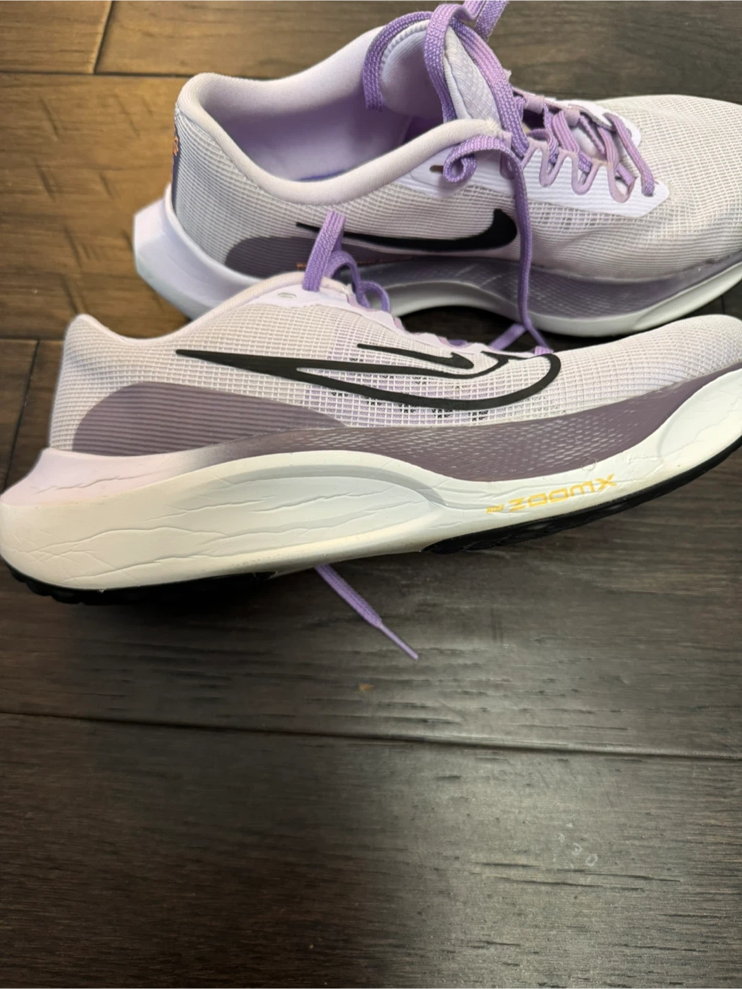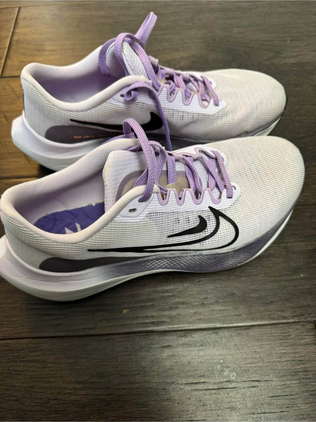 These Nike running shoes are designed for performance and comfort. The shoes feature a lightweight, breathable mesh upper and a supportive sole for impact absorption. They're purple and white, perfect for your next run!