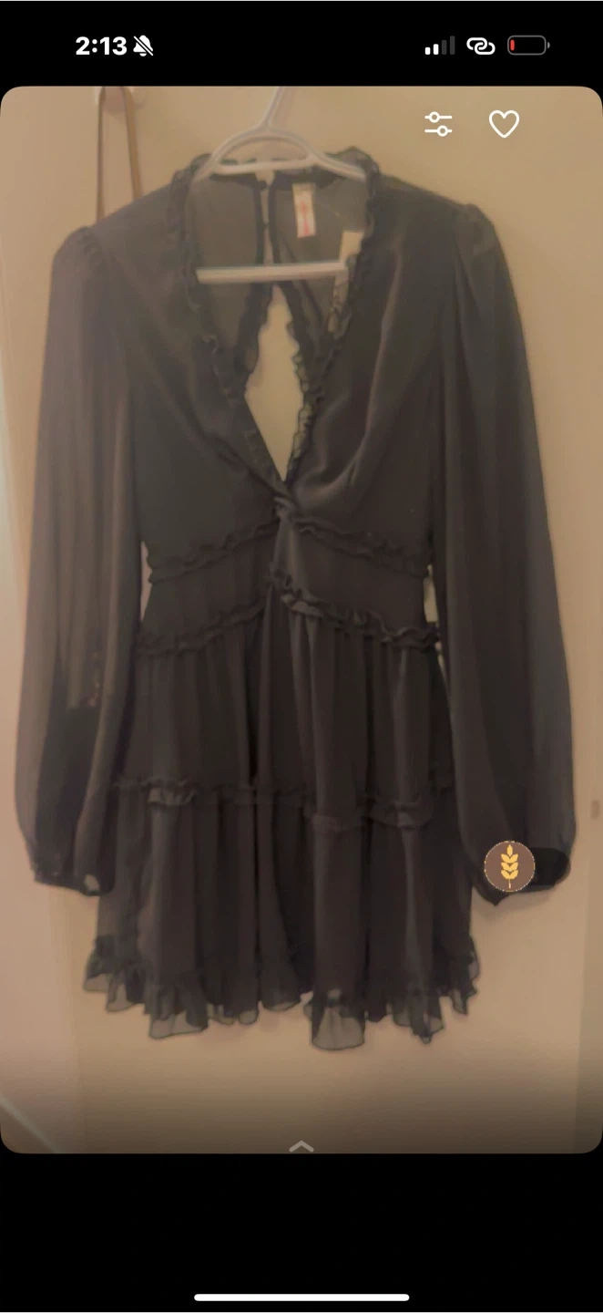 Black sheer mini dress with long sleeves and ruffle detailing. It features tiered layers and a keyhole back. Made from lightweight material.