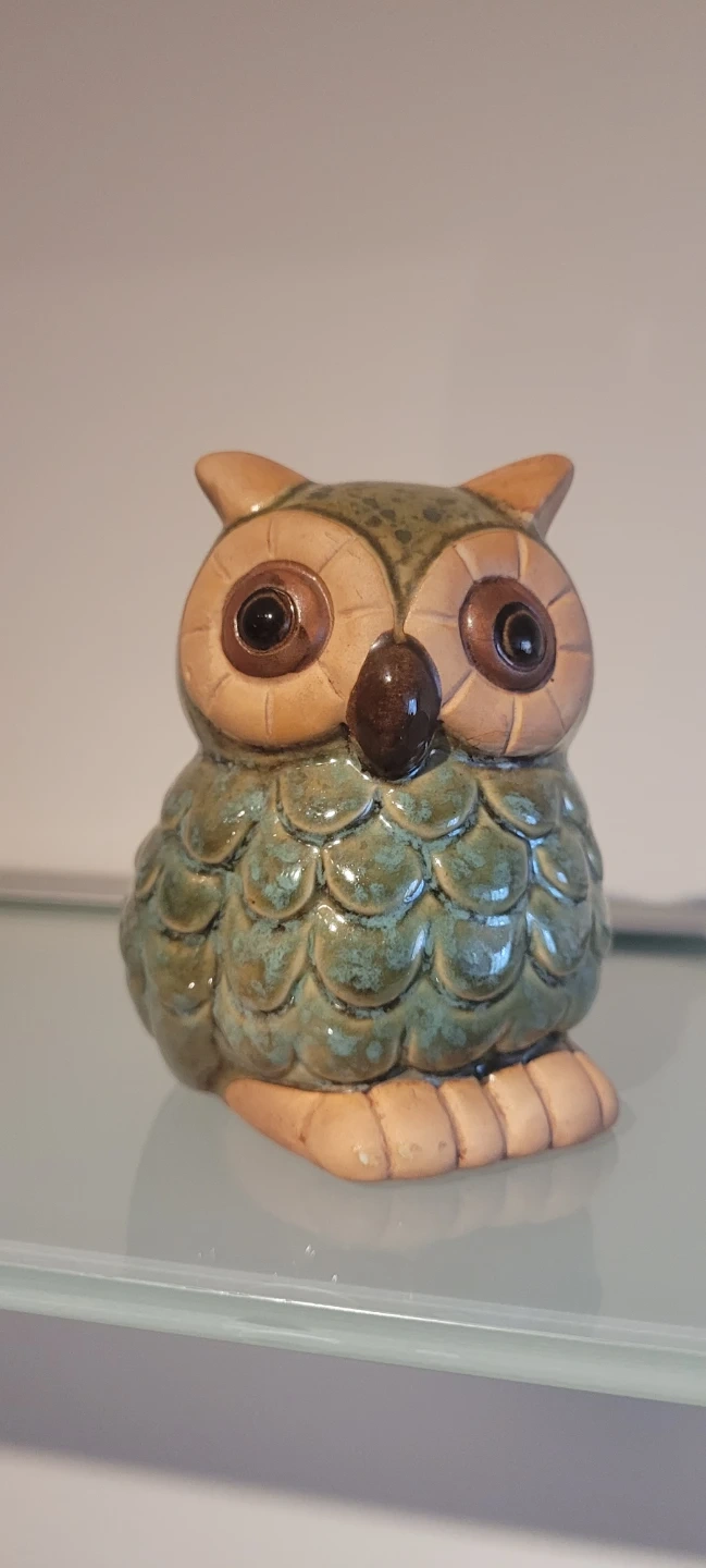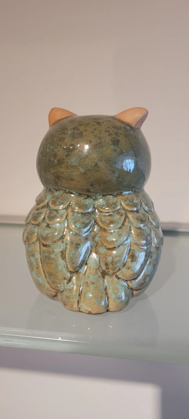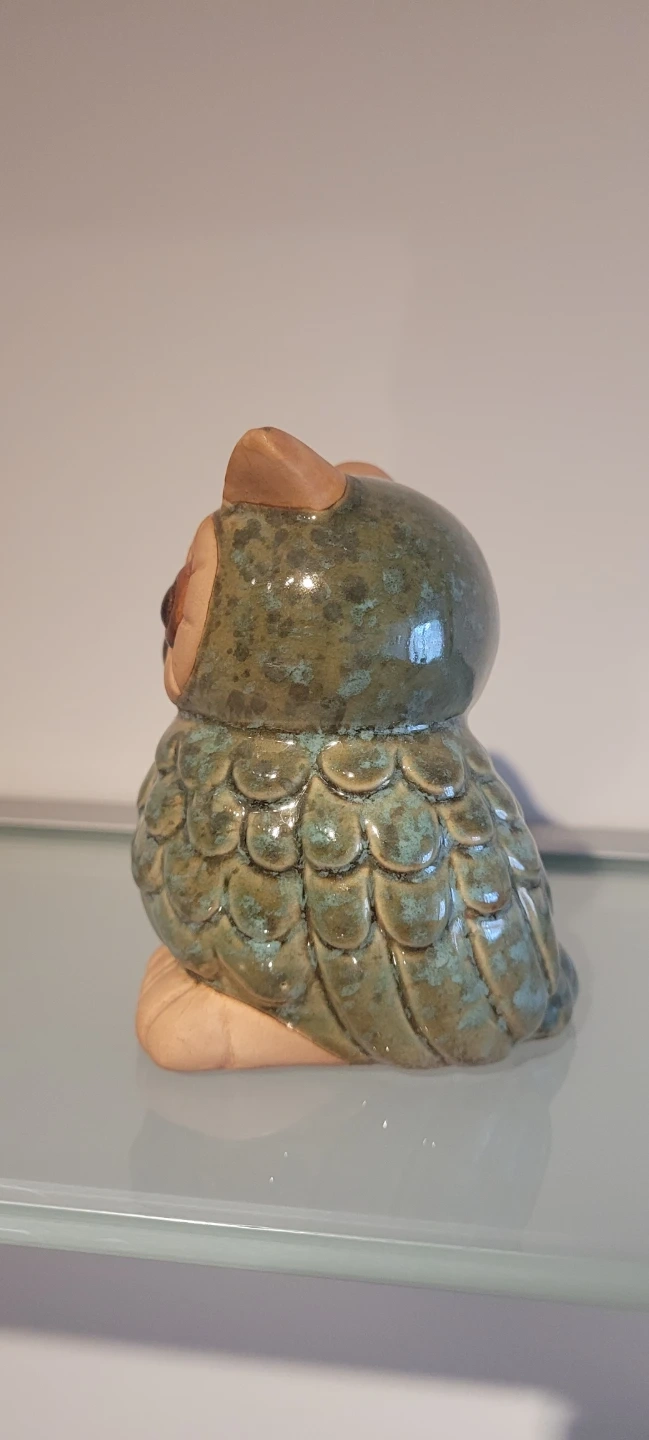Vintage Clay Pottery Owl Figurine, Green Glazed