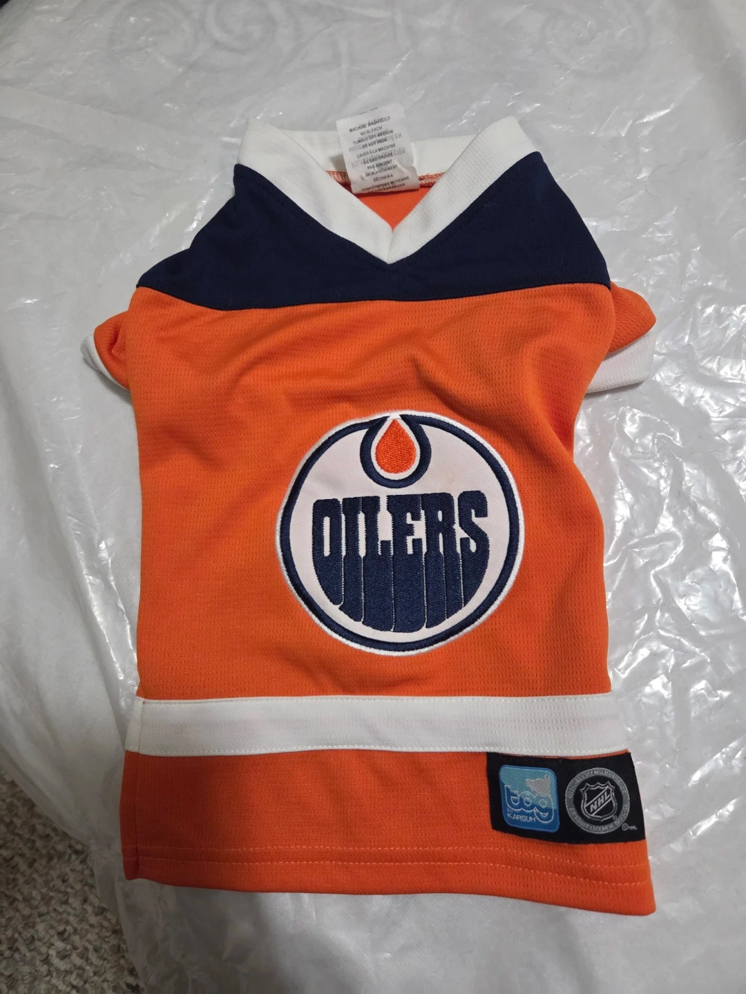 This dog jersey is designed for your pet to sport their favourite team! It's made of 100% polyester for comfort. It has the iconic Edmonton Oilers logo. SO cute!
