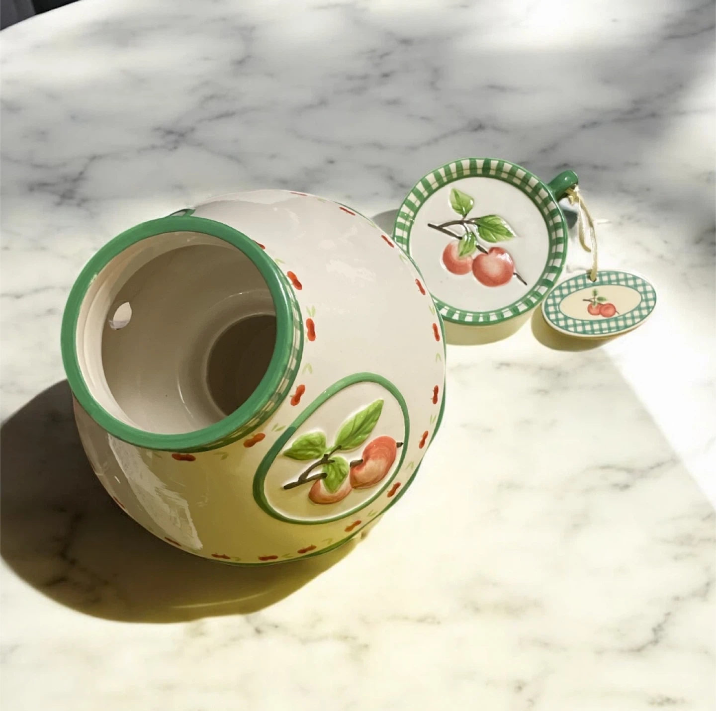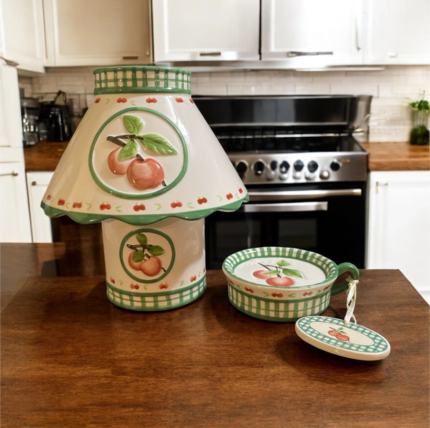 This ceramic lamp comes with the shade and the bottom of the lamp is the canister holder. Also come with and holder & tag. All showing a beautiful apple design.