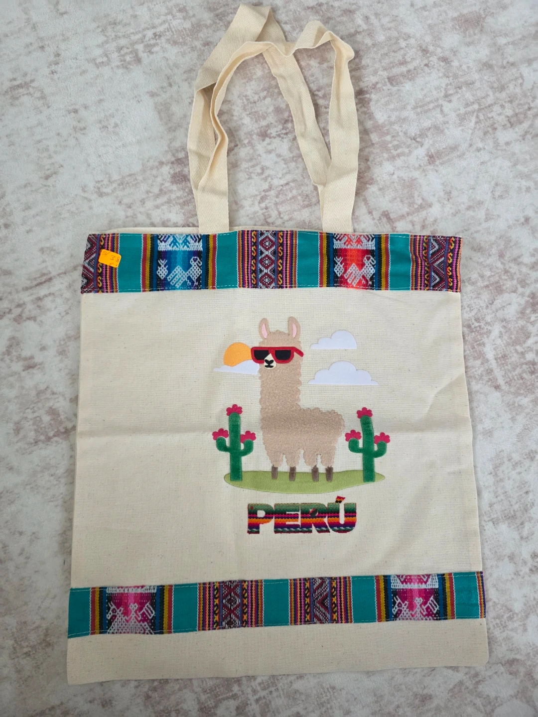 This is a canvas tote bag featuring a fun llama graphic wearing sunglasses with cacti and clouds. The word "PERÚ" is embroidered at the bottom. It has traditional woven trim along the top and bottom edges. It's perfect for carrying groceries or everyday essentials!