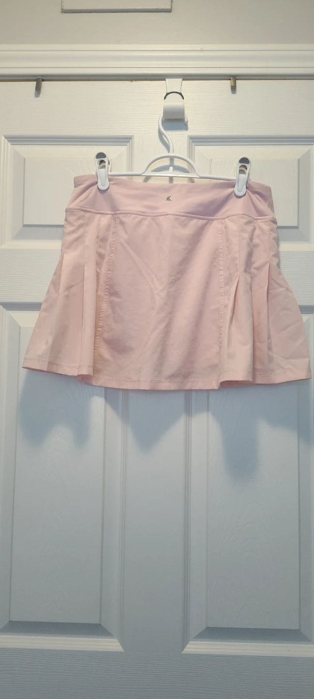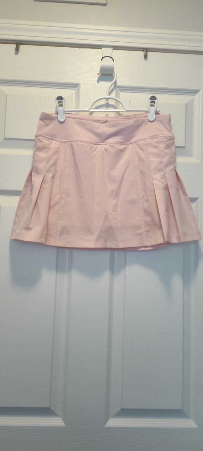 This is a light pink pleated skort. It's made from a stretchy, breathable fabric. This skort is perfect for golfing, tennis or running!