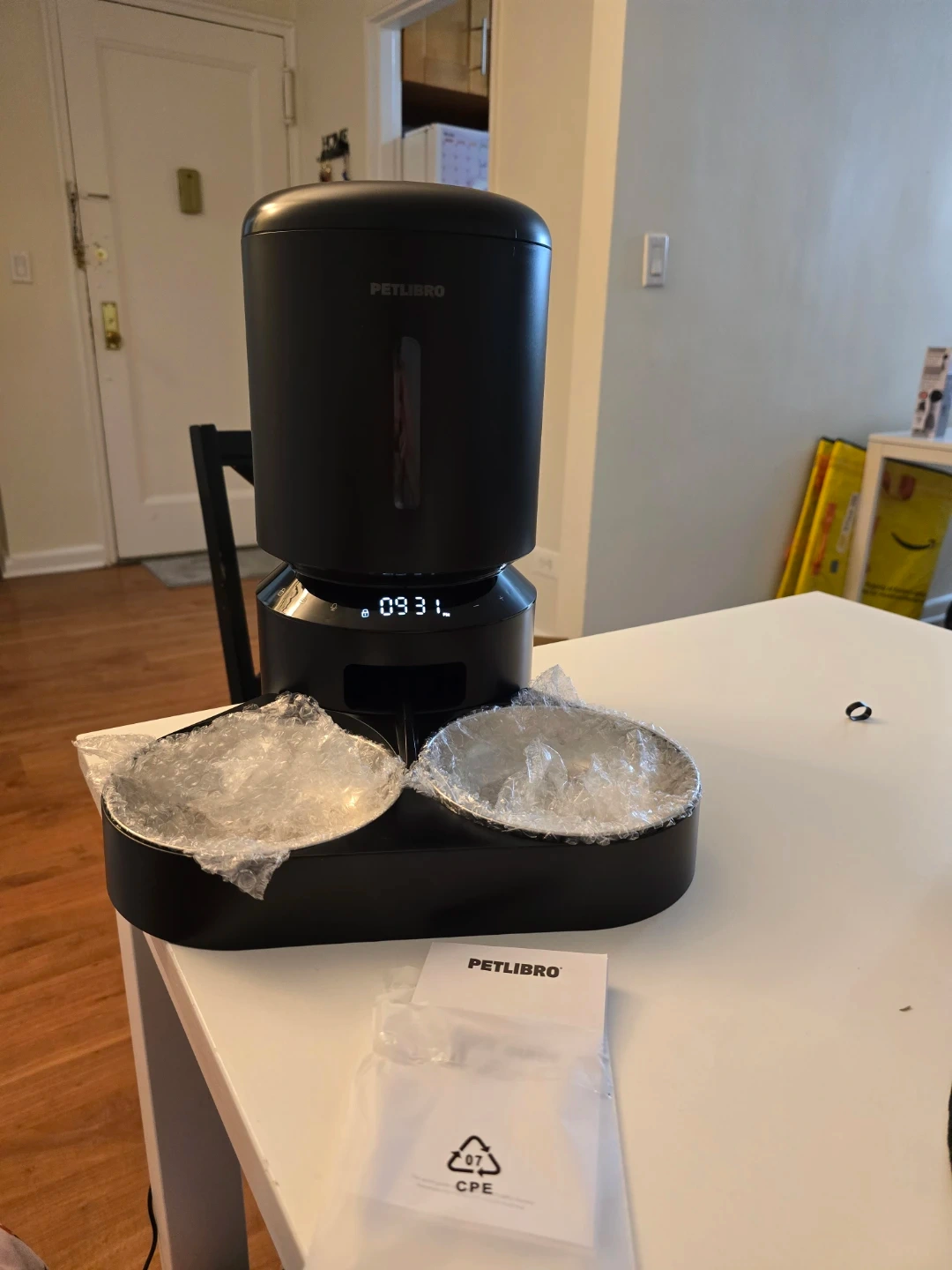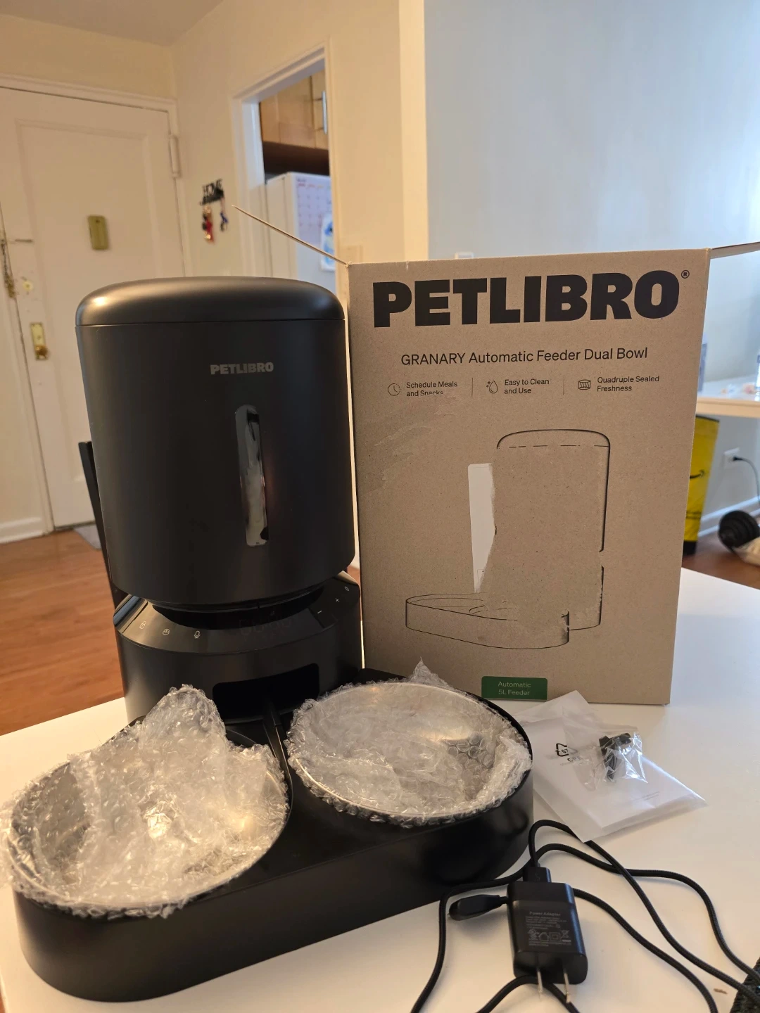 Freshness and stability: The PETLIBRO automatic pet feeder has a built-in desiccant and sealing strip to keep food fresh. The food-grade stainless steel bowl is healthy, hygienic, and easy to clean. The patented rotor design and rotating locking lid effectively prevent pets from stealing food.apter and original box.