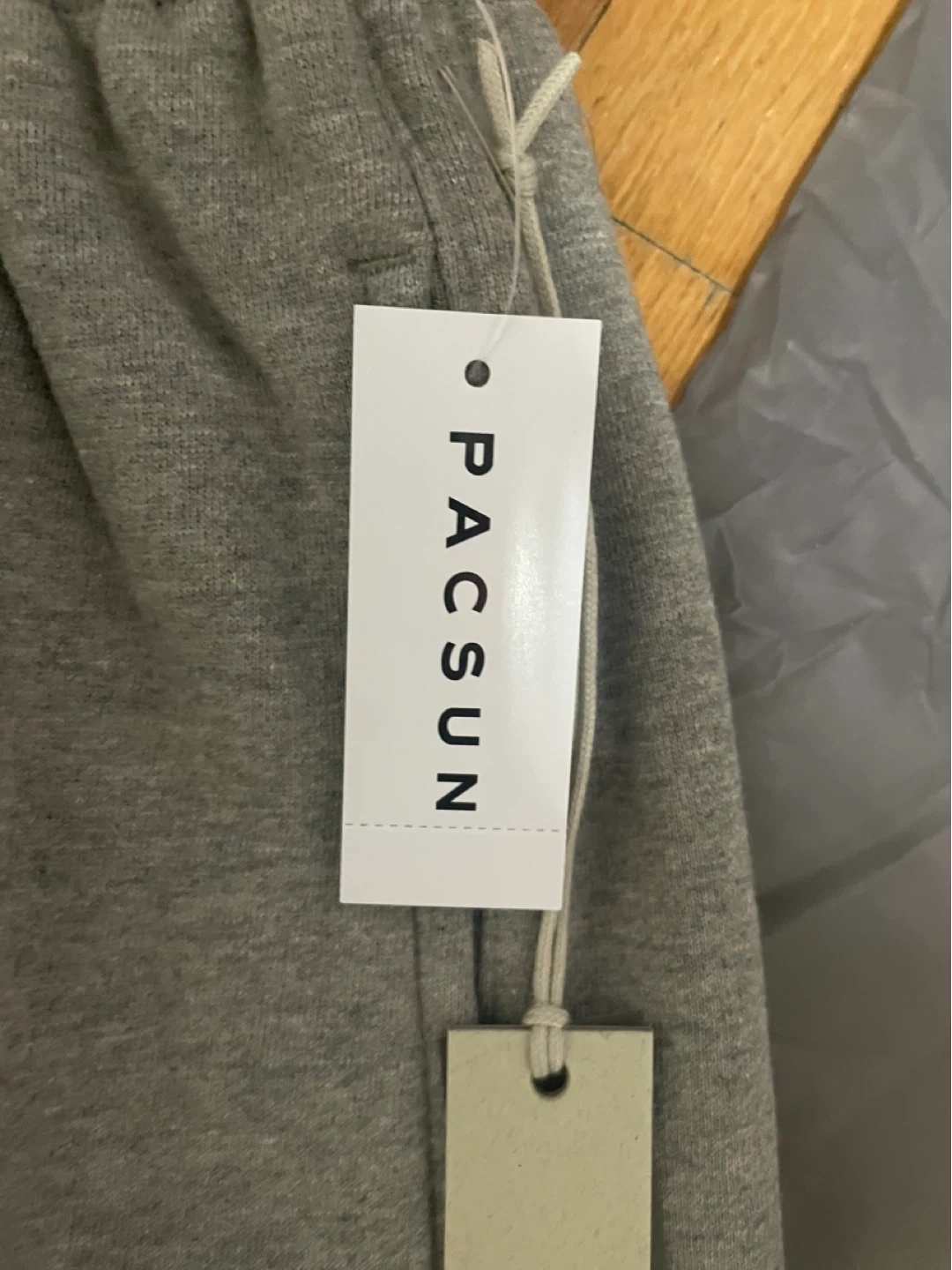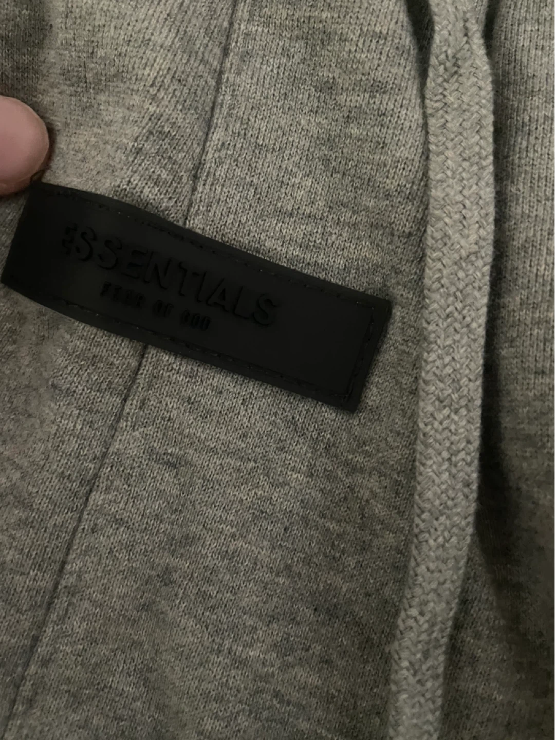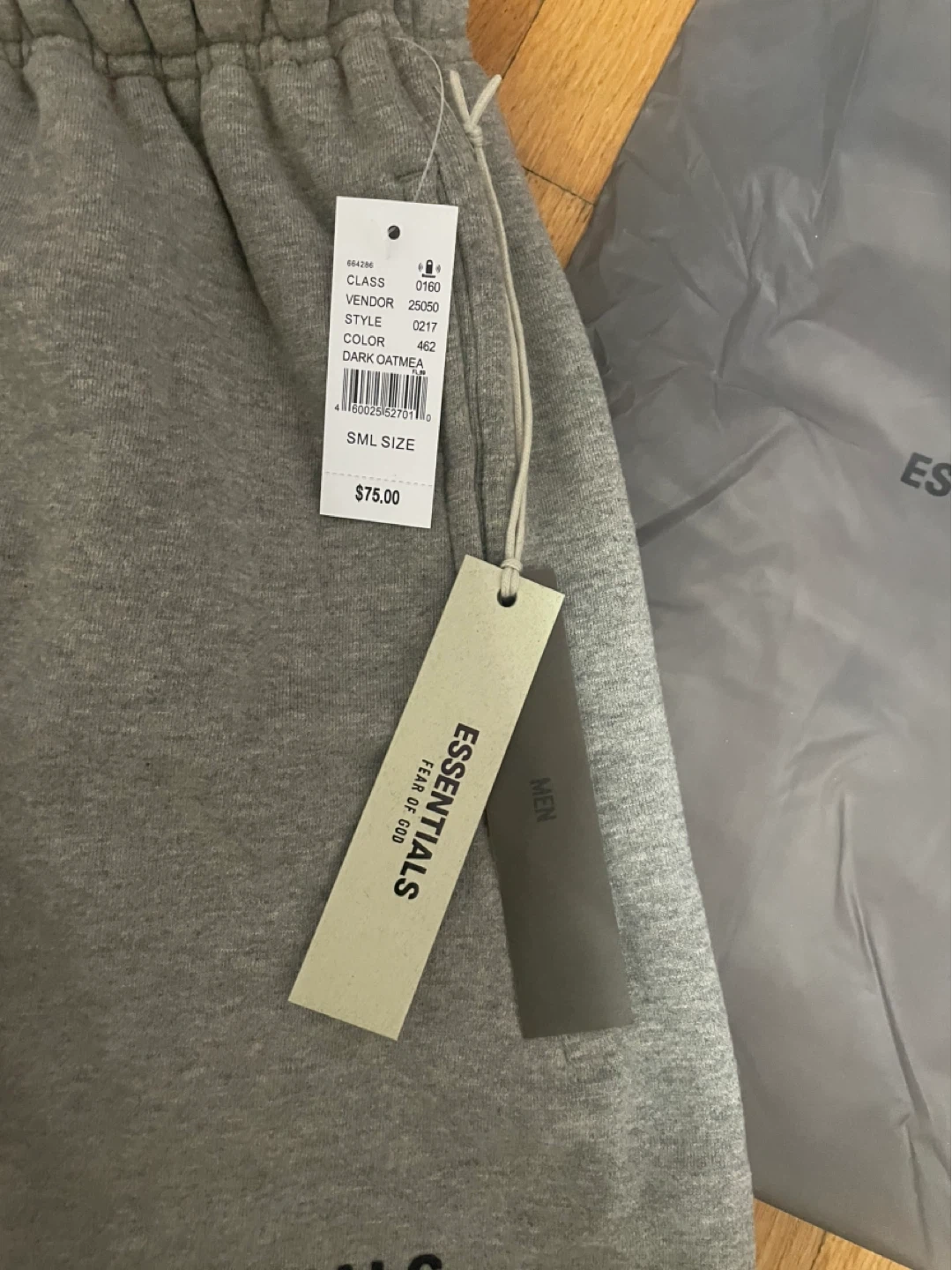 These are Fear of God Essentials sweat shorts in a grey "Dark Oatmeal" color. They're a size S and include the original tags and bag. Cotton blend material.
