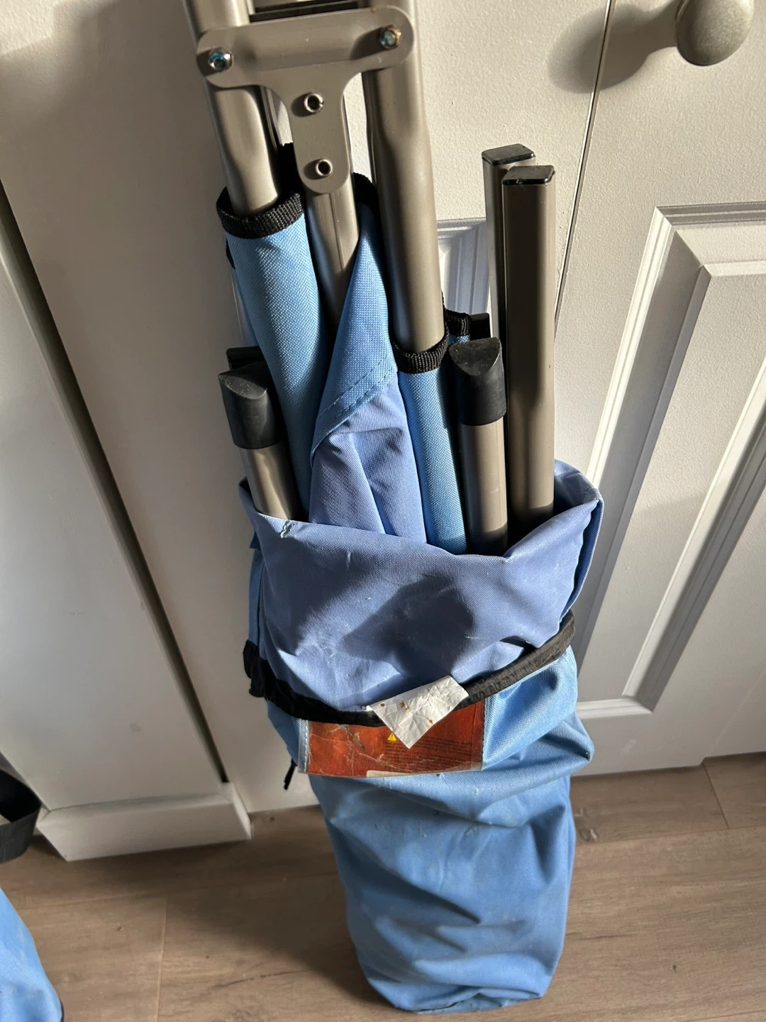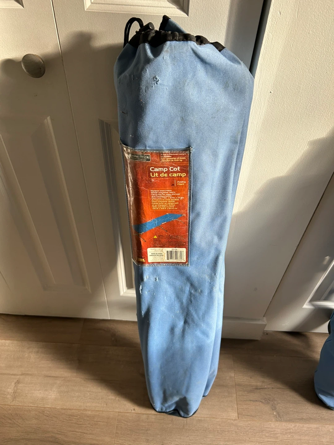 Folding camp cot with a durable steel frame and 600D polyester fabric. It comes with a carry bag for easy storage and transportation. Open size is 75in x 27in x 13.5in.