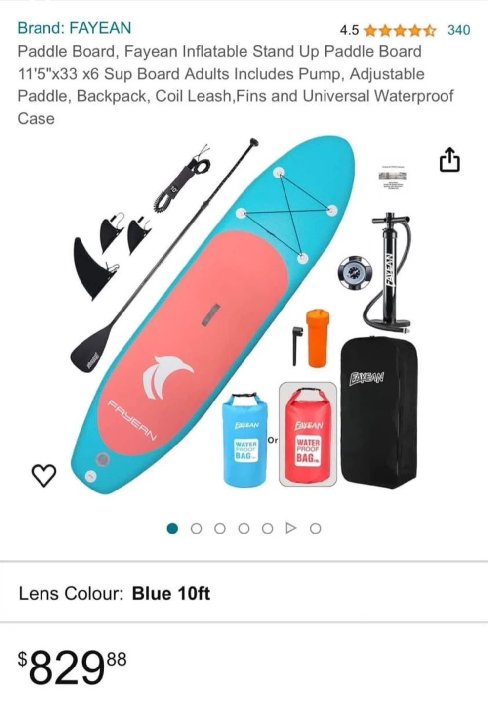 Fayean inflatable stand up paddle board, 11'5" x 33" x 6". It's blue with a coral deck. Includes pump, adjustable paddle, backpack, coil leash, fins, and a universal waterproof case. Great for watersports!