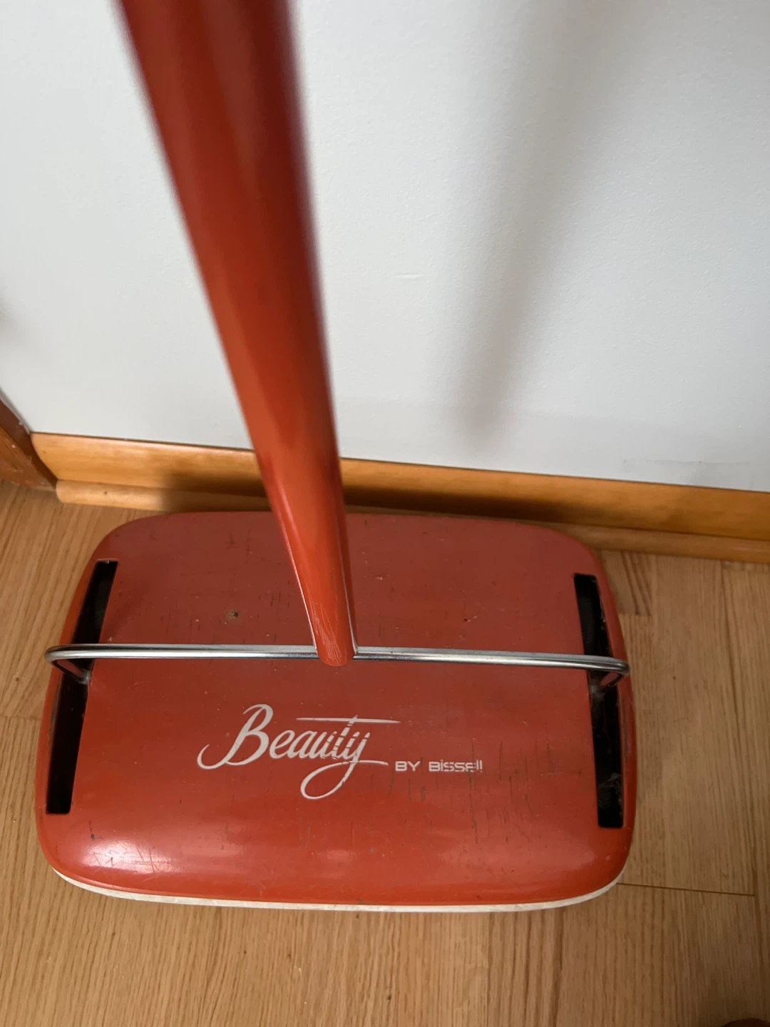 This is a Bissell Beauty carpet sweeper. It's red and comes with a metal handle. Great for quick cleanups!