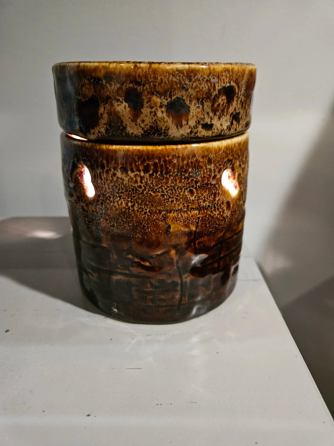 This ceramic wax melt warmer features a unique mottled brown glaze. It's designed with cut-out accents that allow light to shine through. The top dish holds your favourite wax melts.