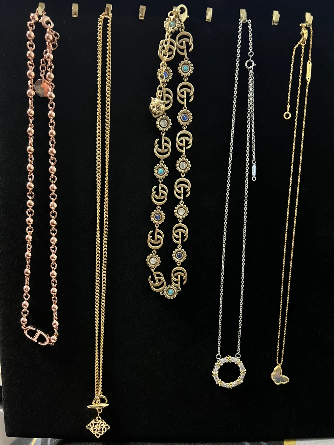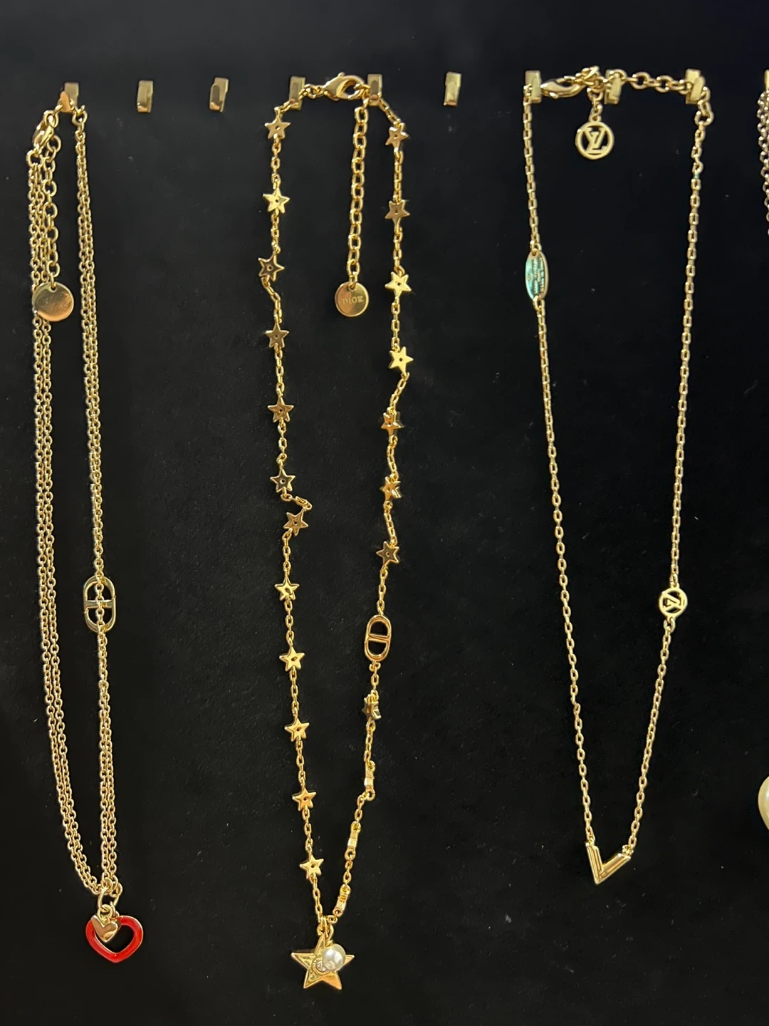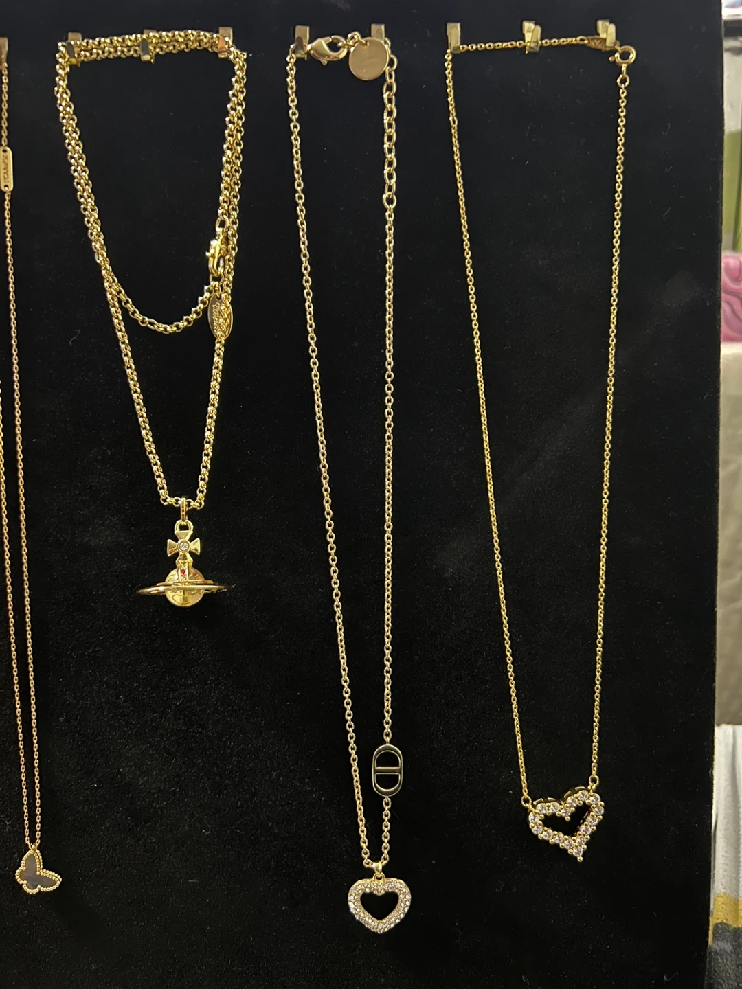 A collection of beautiful necklaces from various designer brands including Louis Vuitton, Chanel, Dior, Gucci, Vivienne Westwood, and Miu Miu. Each piece features unique charms and chain styles.