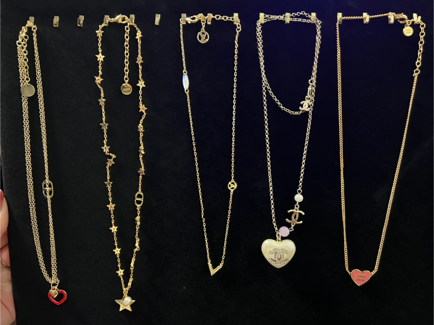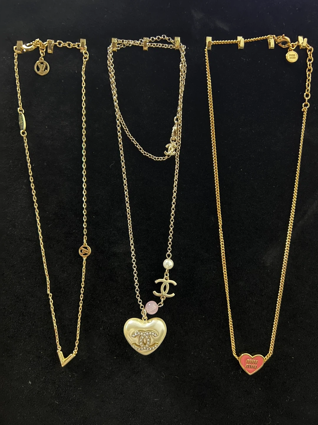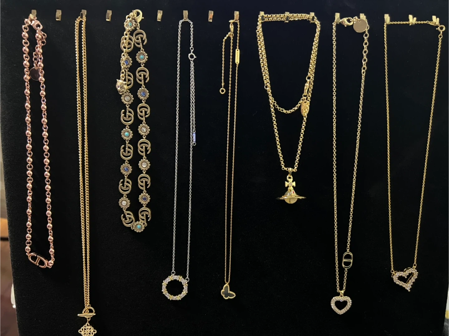A collection of beautiful necklaces from various designer brands including Louis Vuitton, Chanel, Dior, Gucci, Vivienne Westwood, and Miu Miu. Each piece features unique charms and chain styles.