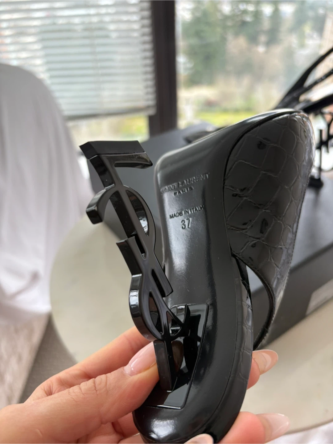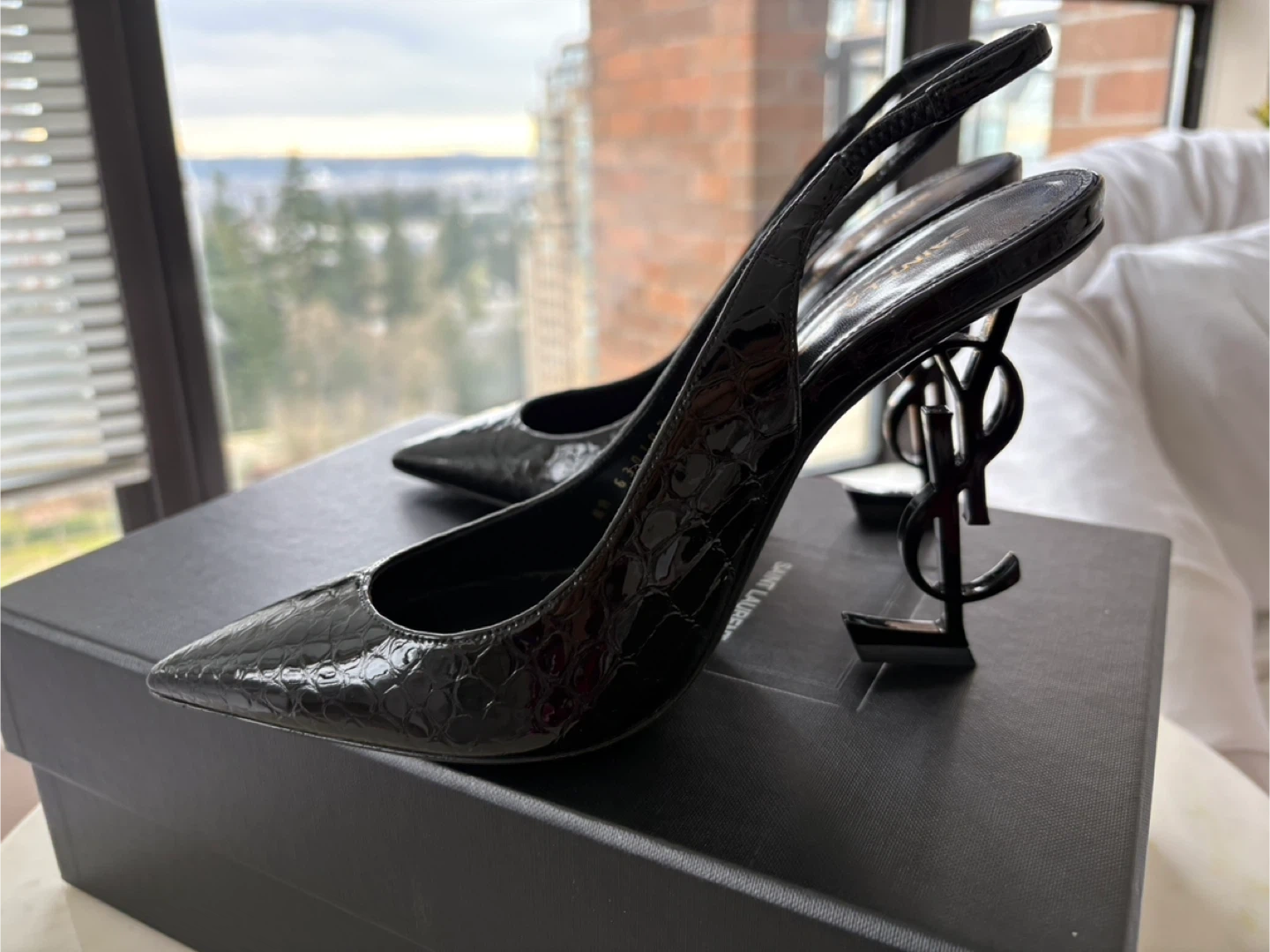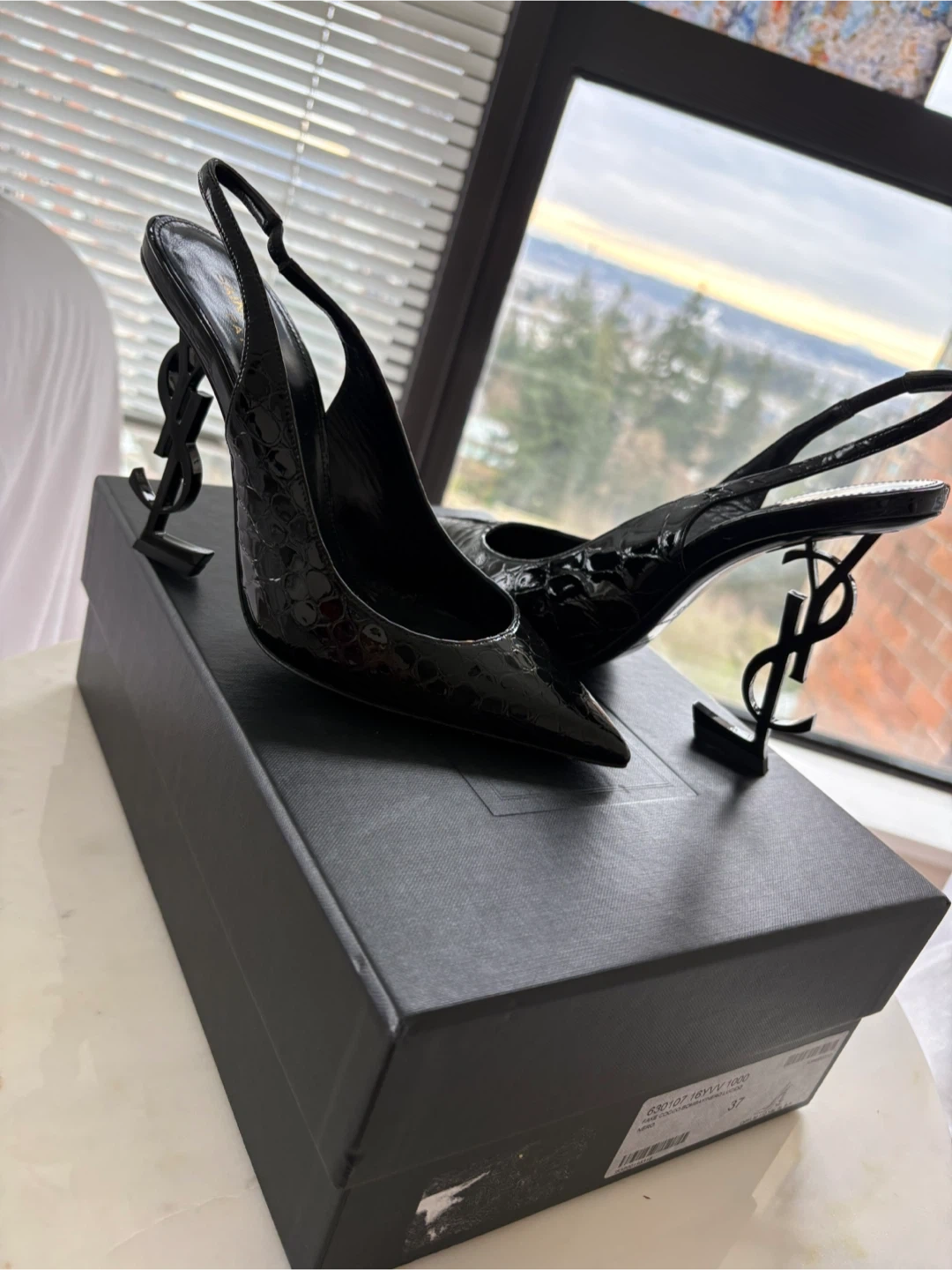 Saint Laurent Black Croc Embossed Slingback Heels Size 37