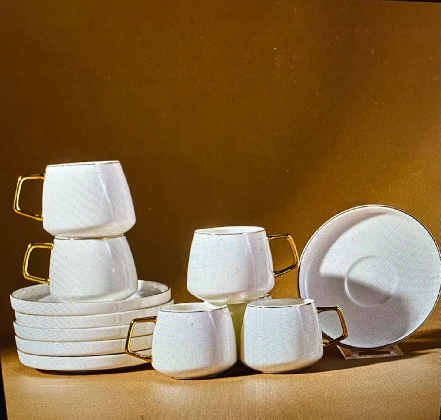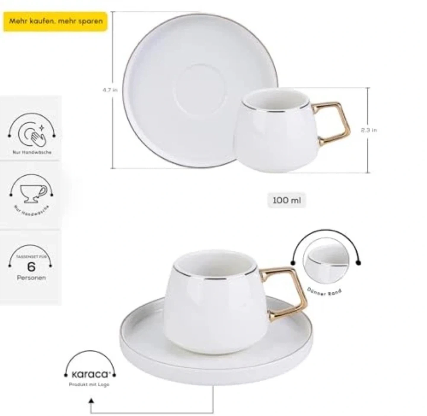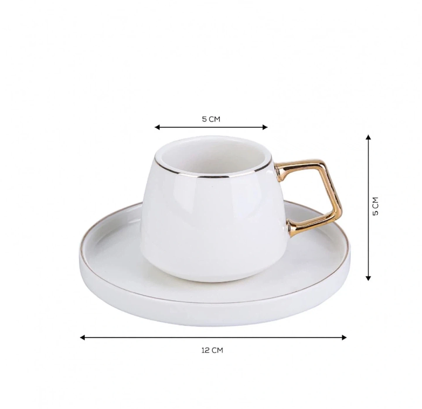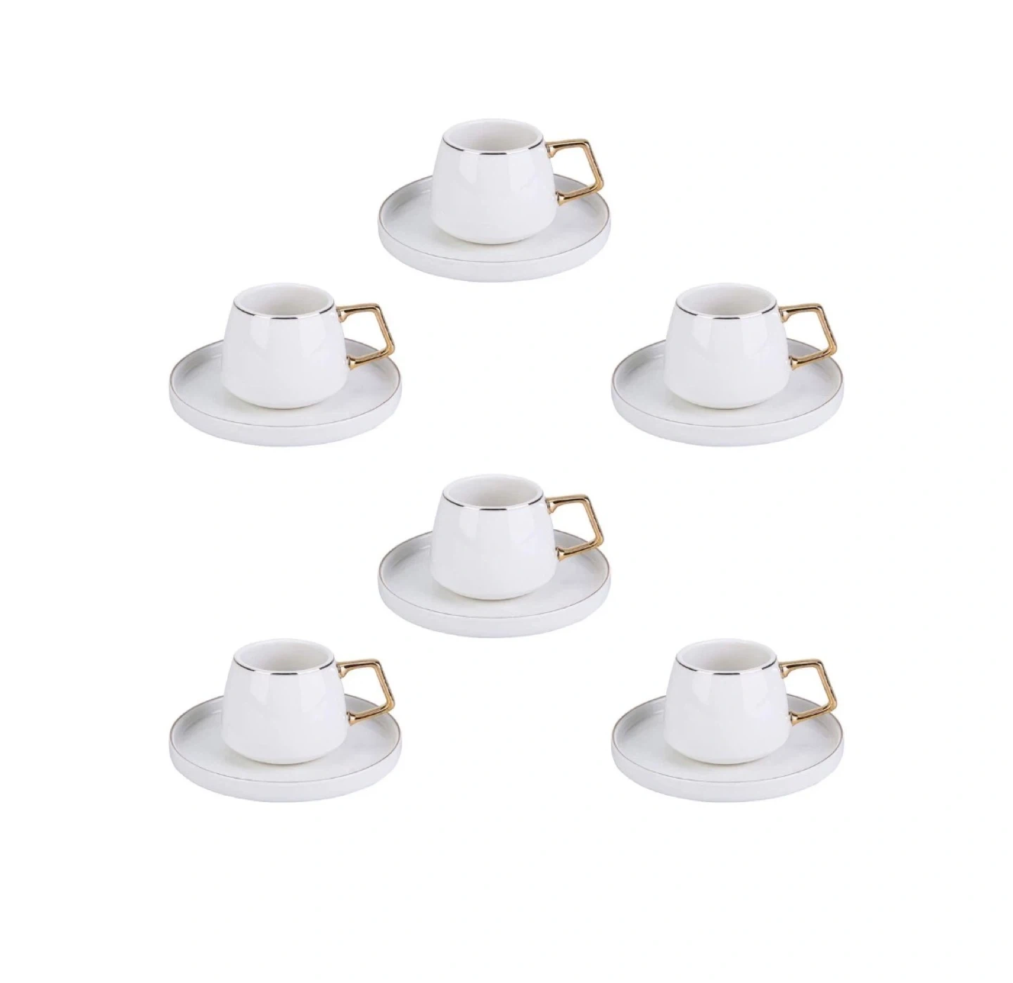 This set includes six white espresso cups and matching saucers. Each cup holds 100ml and features a stylish gold-toned handle. Hand wash recommended for care.