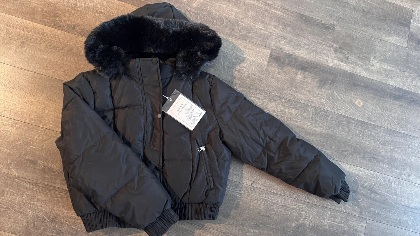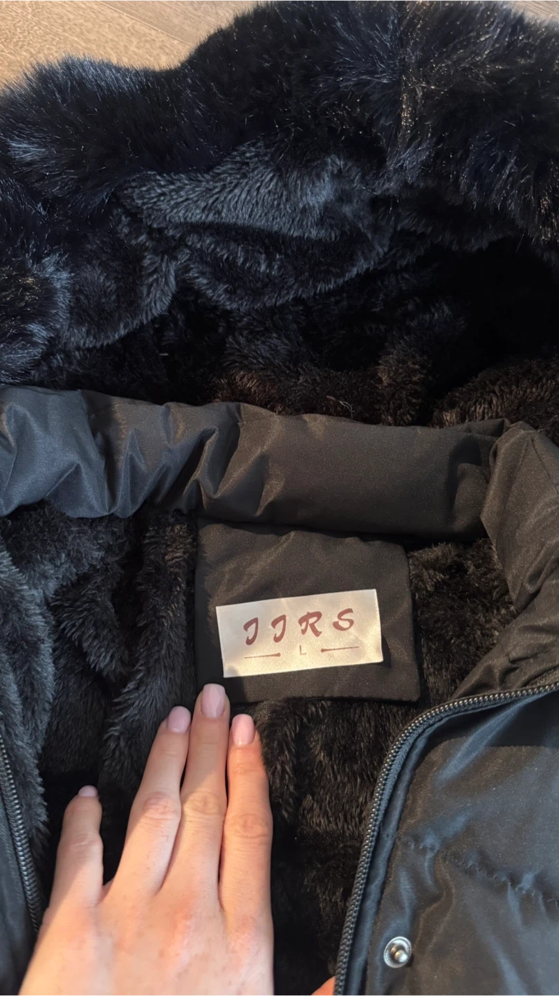 Selling a JinjingriShang black puffer jacket in size L. It's in great condition and features a fur-trimmed hood. Perfect for staying warm this winter!