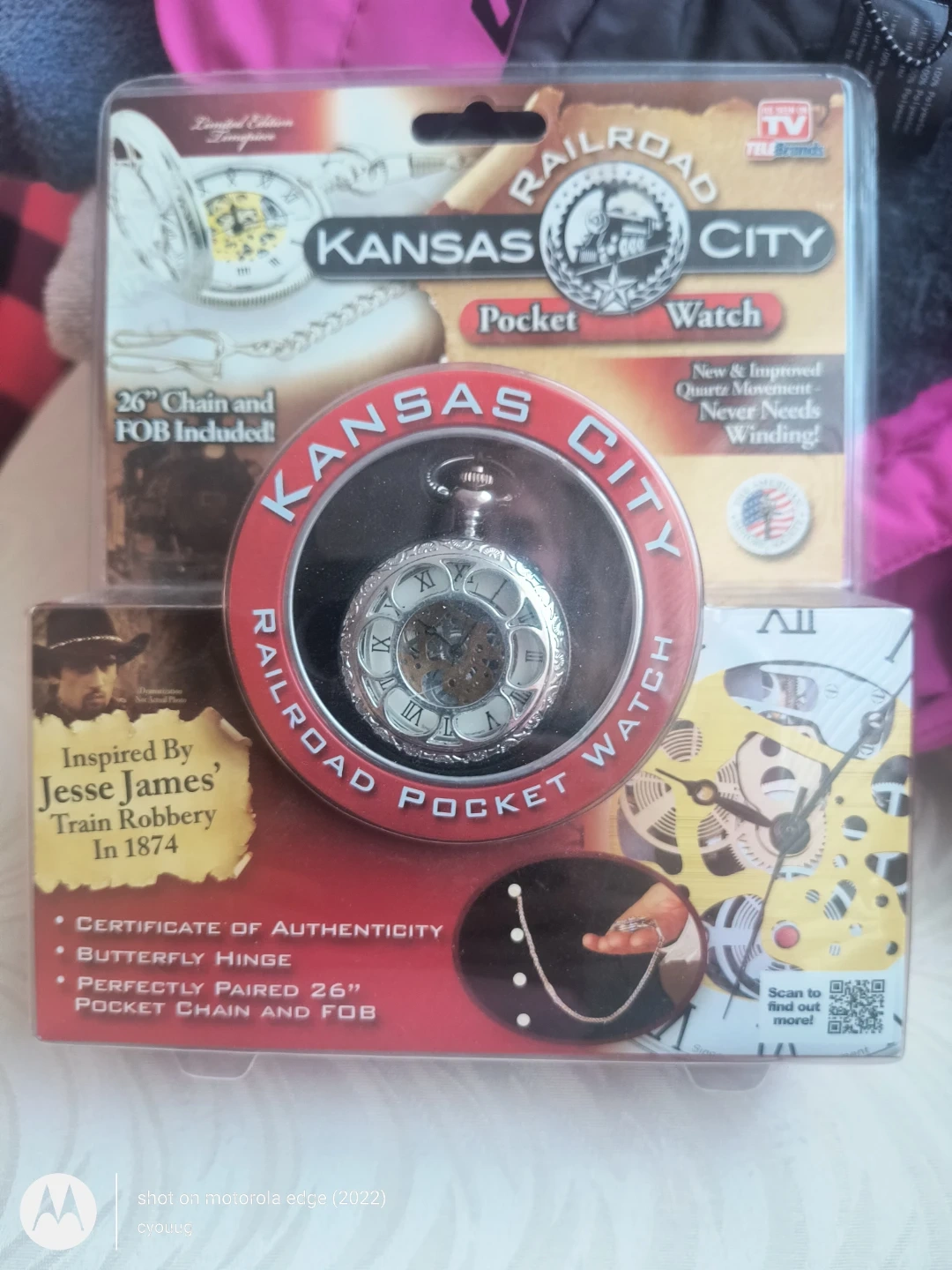 This Kansas City Railroad pocket watch features a new and improved quartz movement that never needs winding. It includes a certificate of authenticity, a butterfly hinge, and a perfectly paired 26" pocket chain and FOB. This watch is inspired by Jesse James' train robbery in 1874.