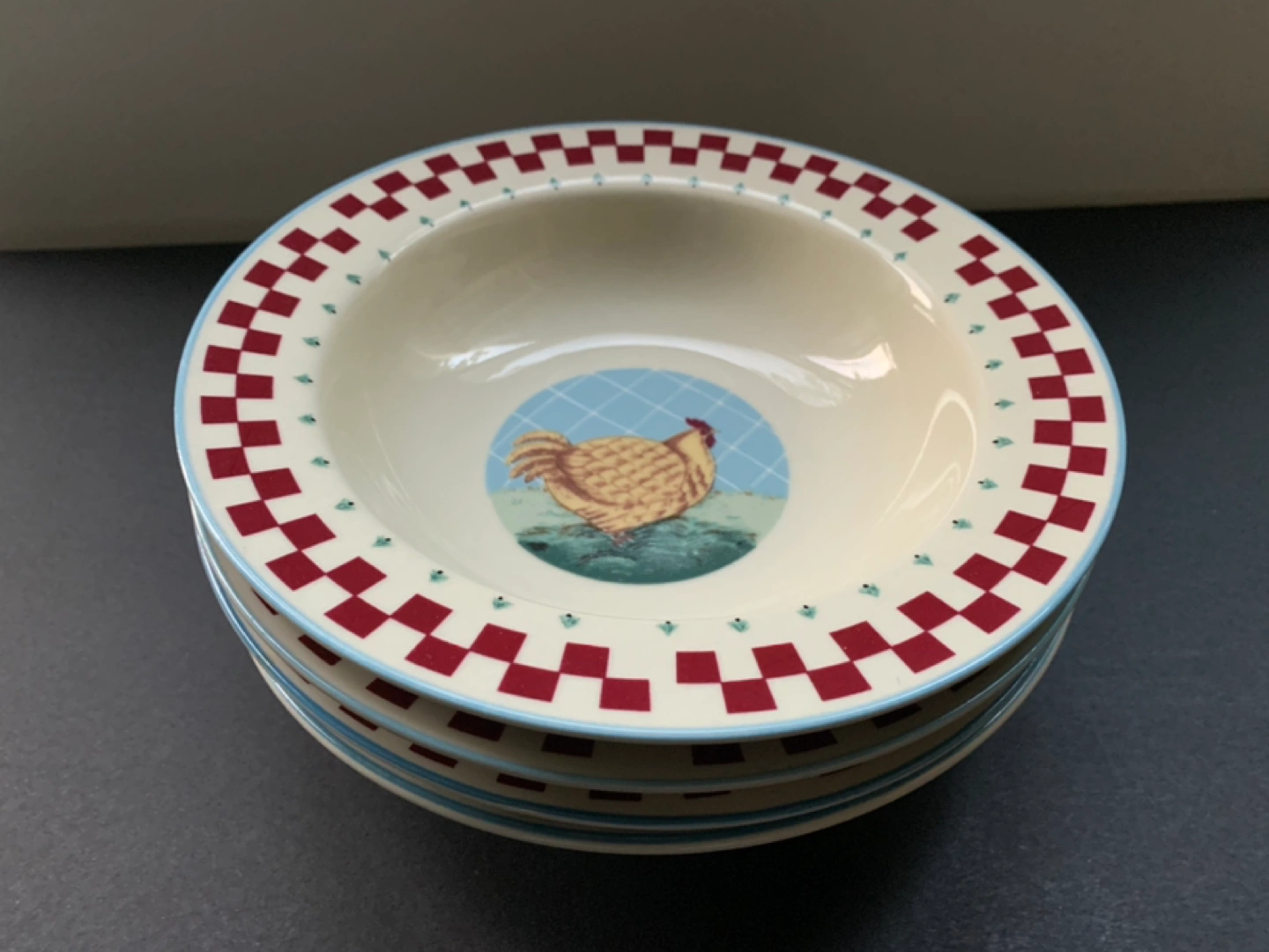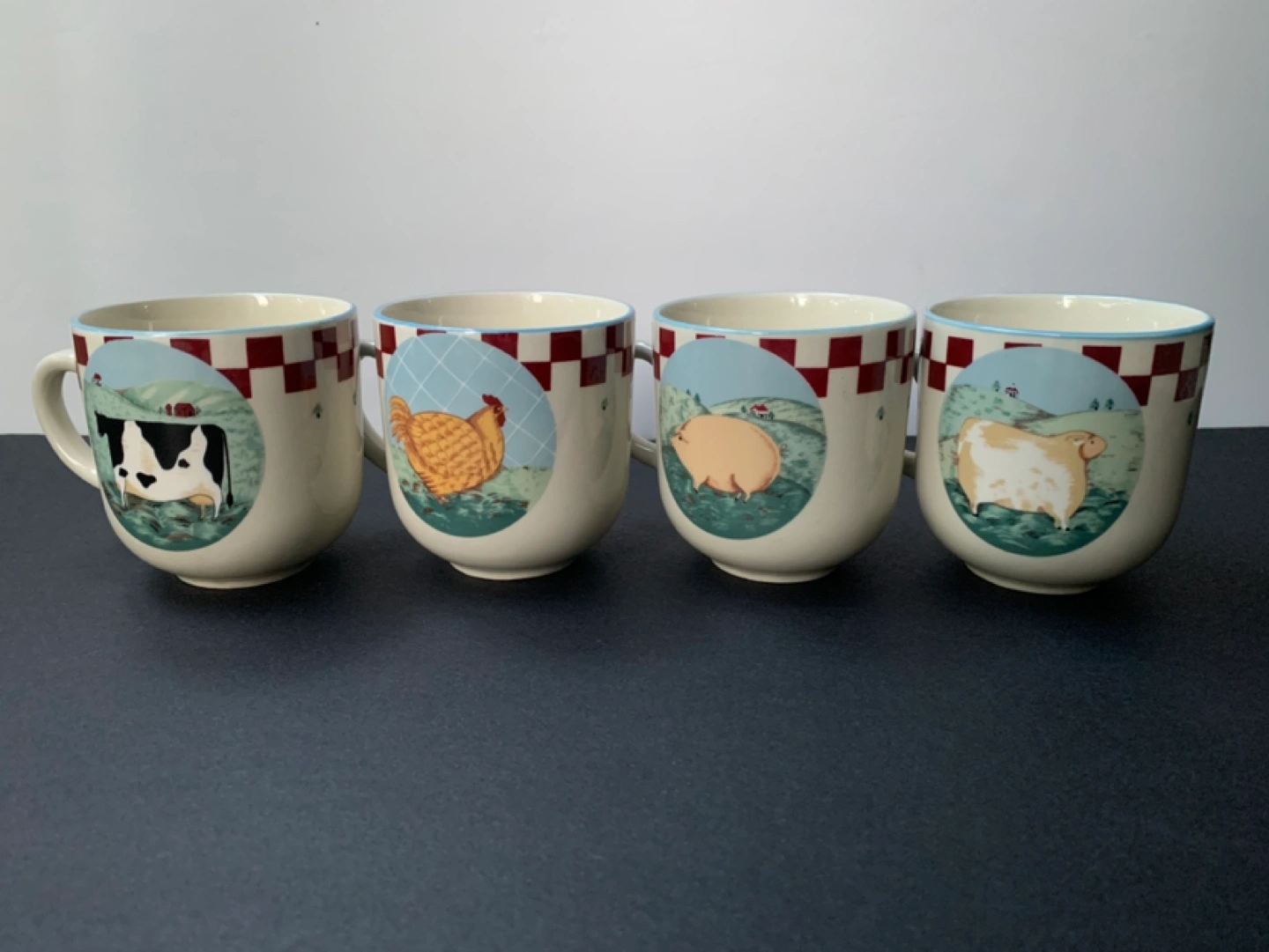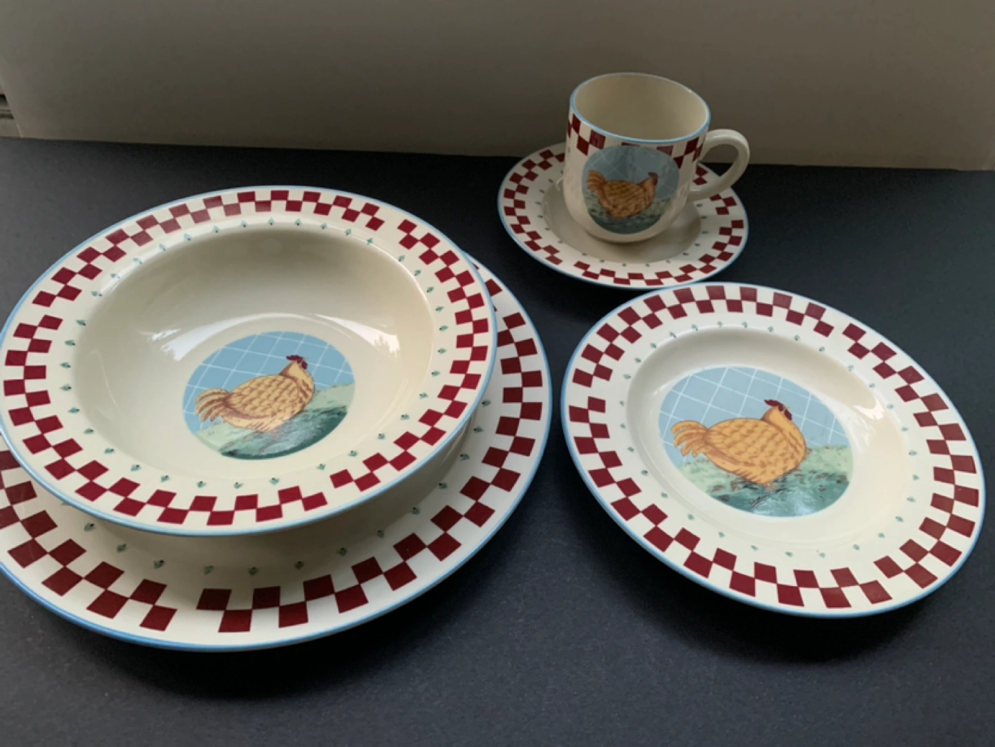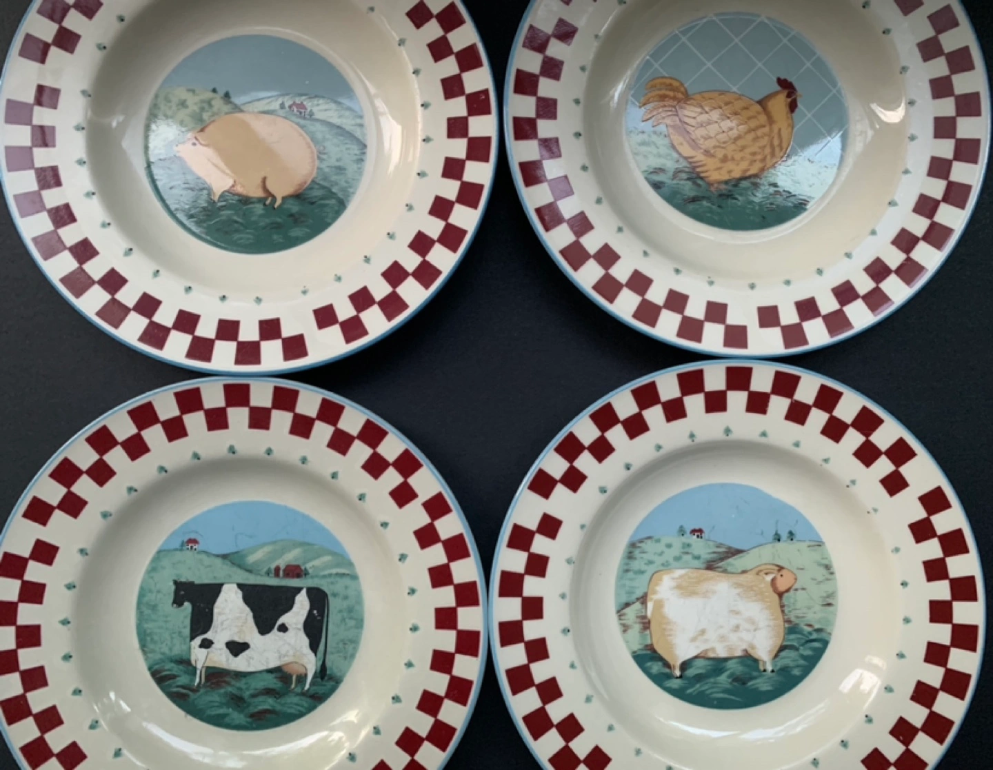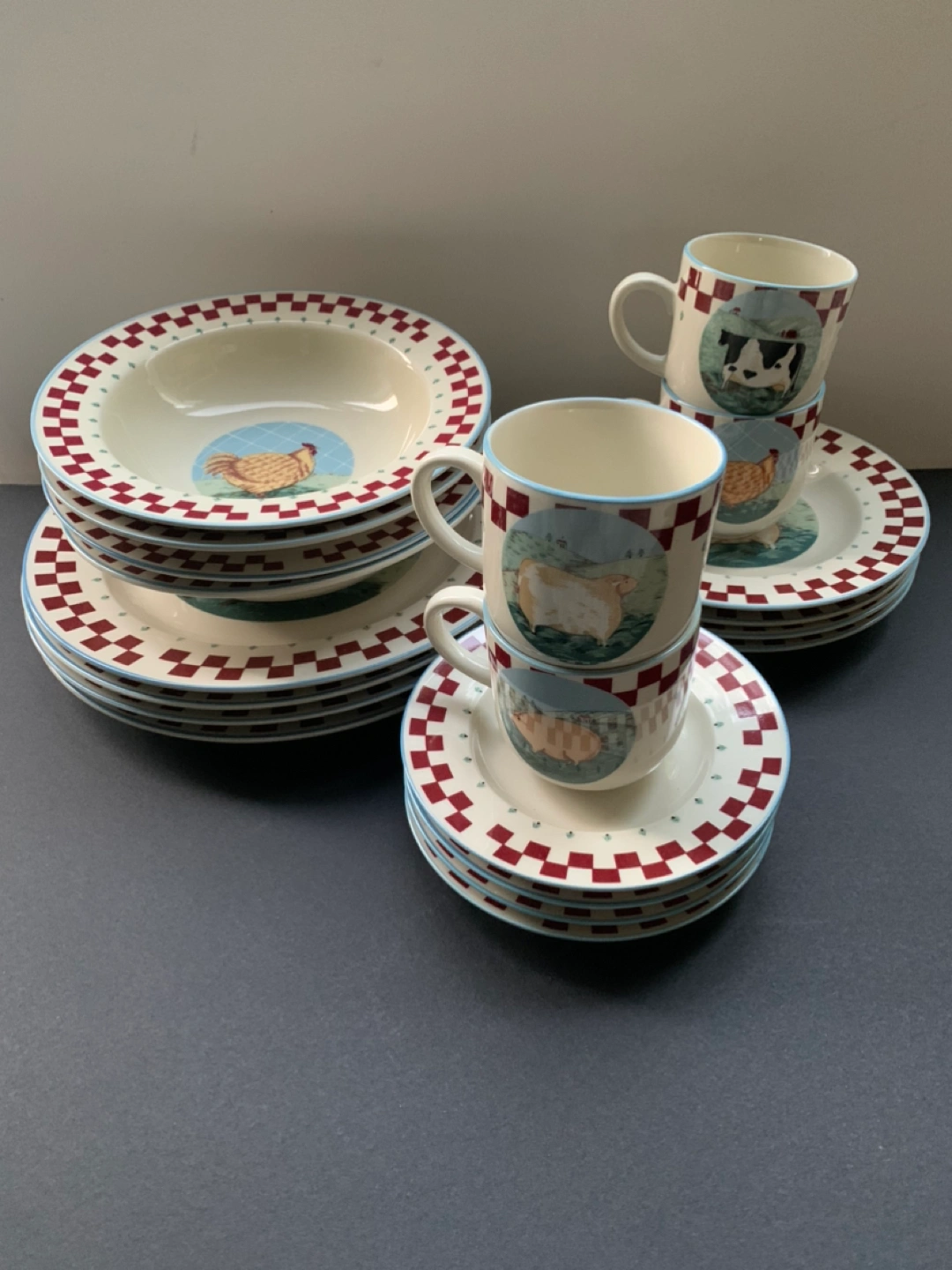 Porcelain Stonewear for 4. Good large size plates and bowls. One farm animal for each member of the family or kids!