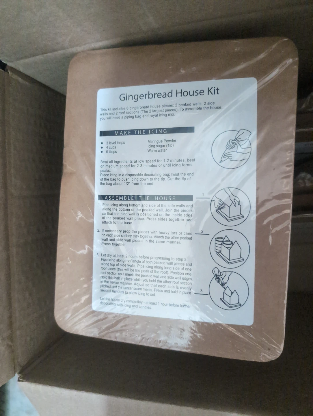 This kit includes gingerbread house pieces for assembly. It contains meringue powder instructions for making royal icing. Make a fun gingerbread house with this kit!