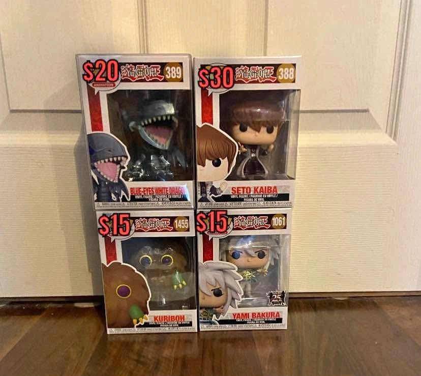 5Prices: - Seto Kaiba #388: $30 - Blue Eyes White Dragon #389: $20 - Kuriboh #1455: $15 - Yami Bakura #1061: $15