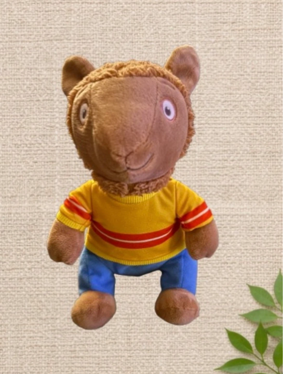 A cuddly Llama Llama Red Pajama plush inspired by the beloved children’s book character. This soft brown llama features embroidered facial details and the classic outfit — a yellow top with red stripes and blue pants — making it instantly recognizable to fans of the story.