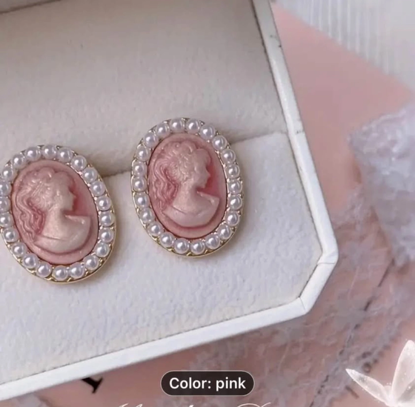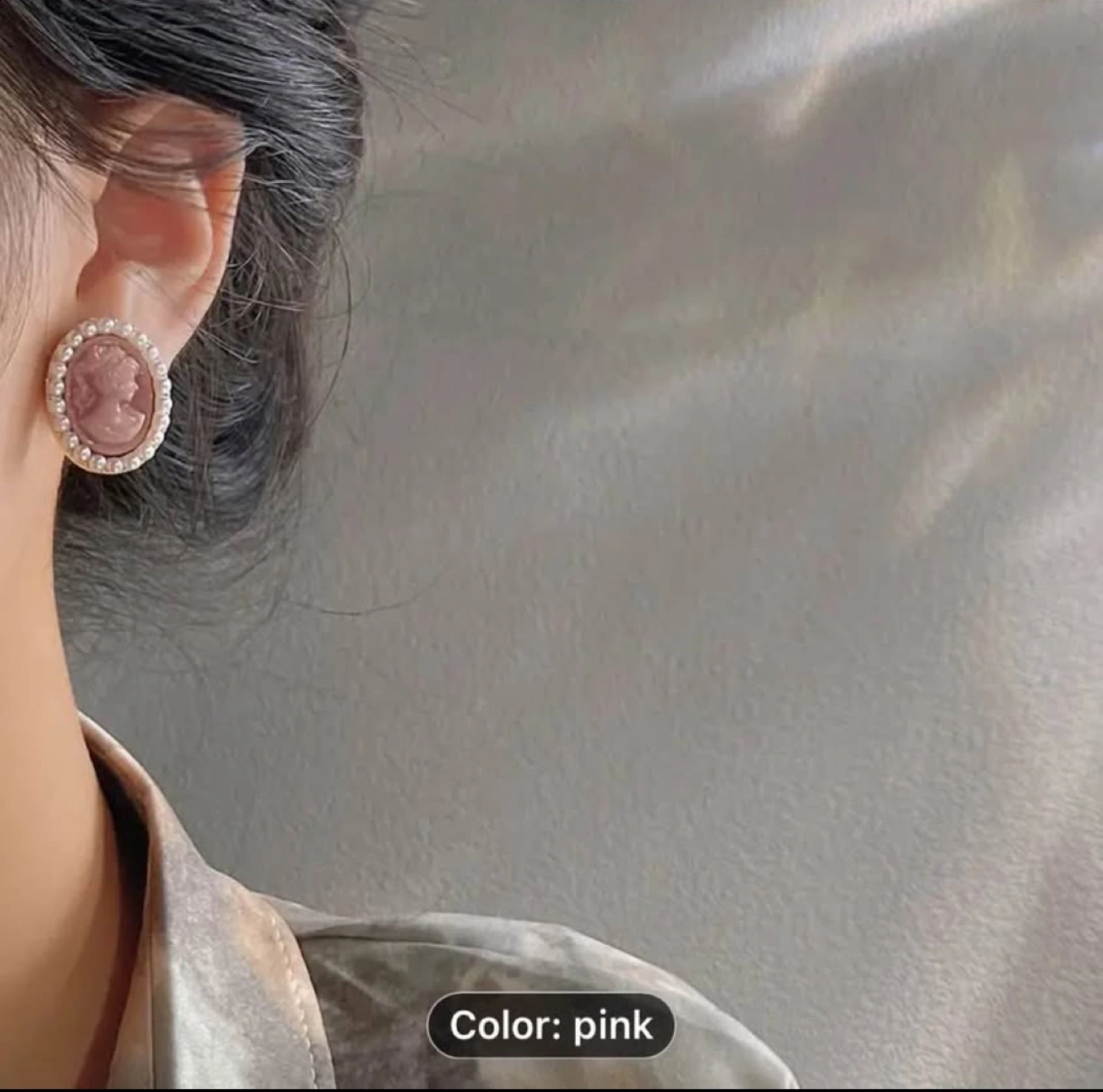 Elegant cameo stud earrings. Pink resin cameo featuring a woman's profile. Surrounded by small faux pearls. Gold-toned metal setting. Perfect for adding a touch of vintage charm to any outfit.