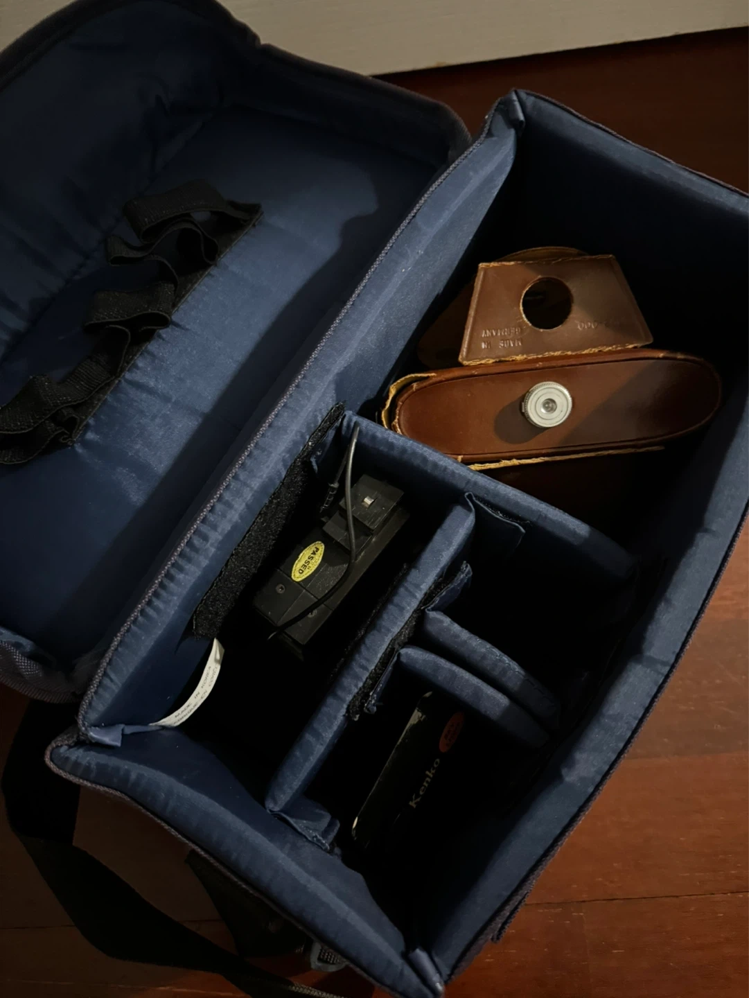 A durable fabric camera bag labelled 'IMAGE' with a padded interior and adjustable dividers. It comes with a vintage camera inside, which appears to be a manual focus model with a leatherette finish. This bag is great for protecting your camera gear!