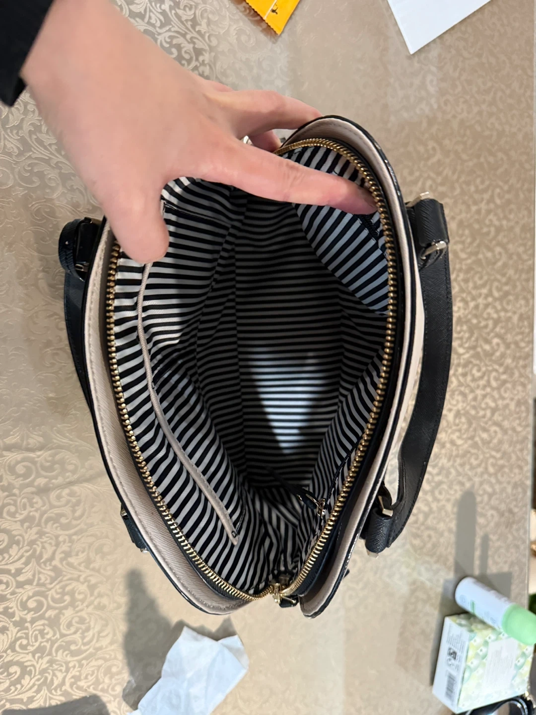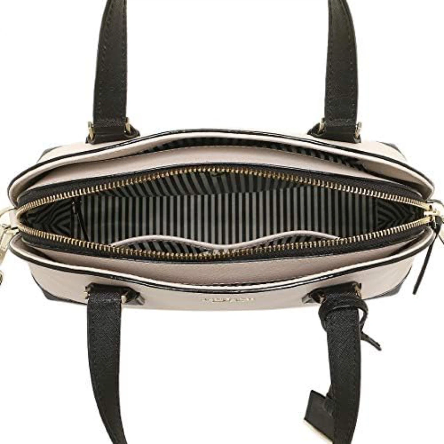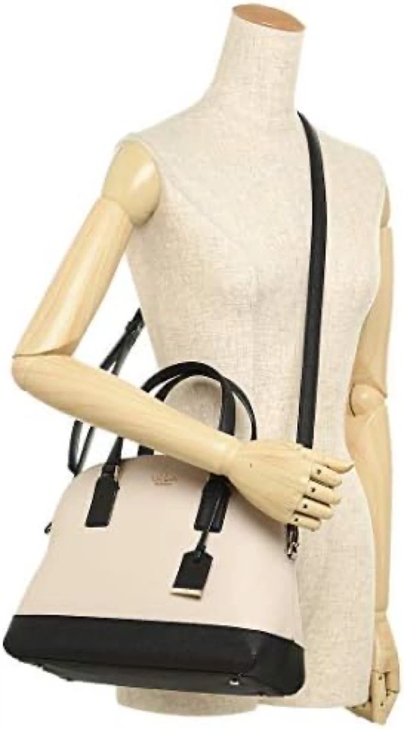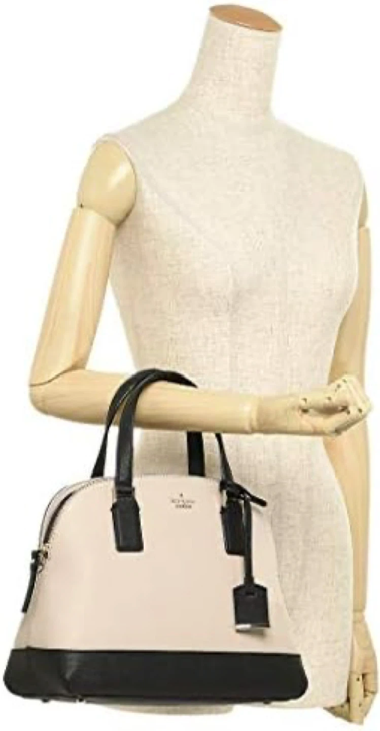 This is a Kate Spade New York dome satchel in cream and black. It features top handles and a detachable crossbody strap. It's a stylish and versatile handbag. Interior has striped lining with pockets.