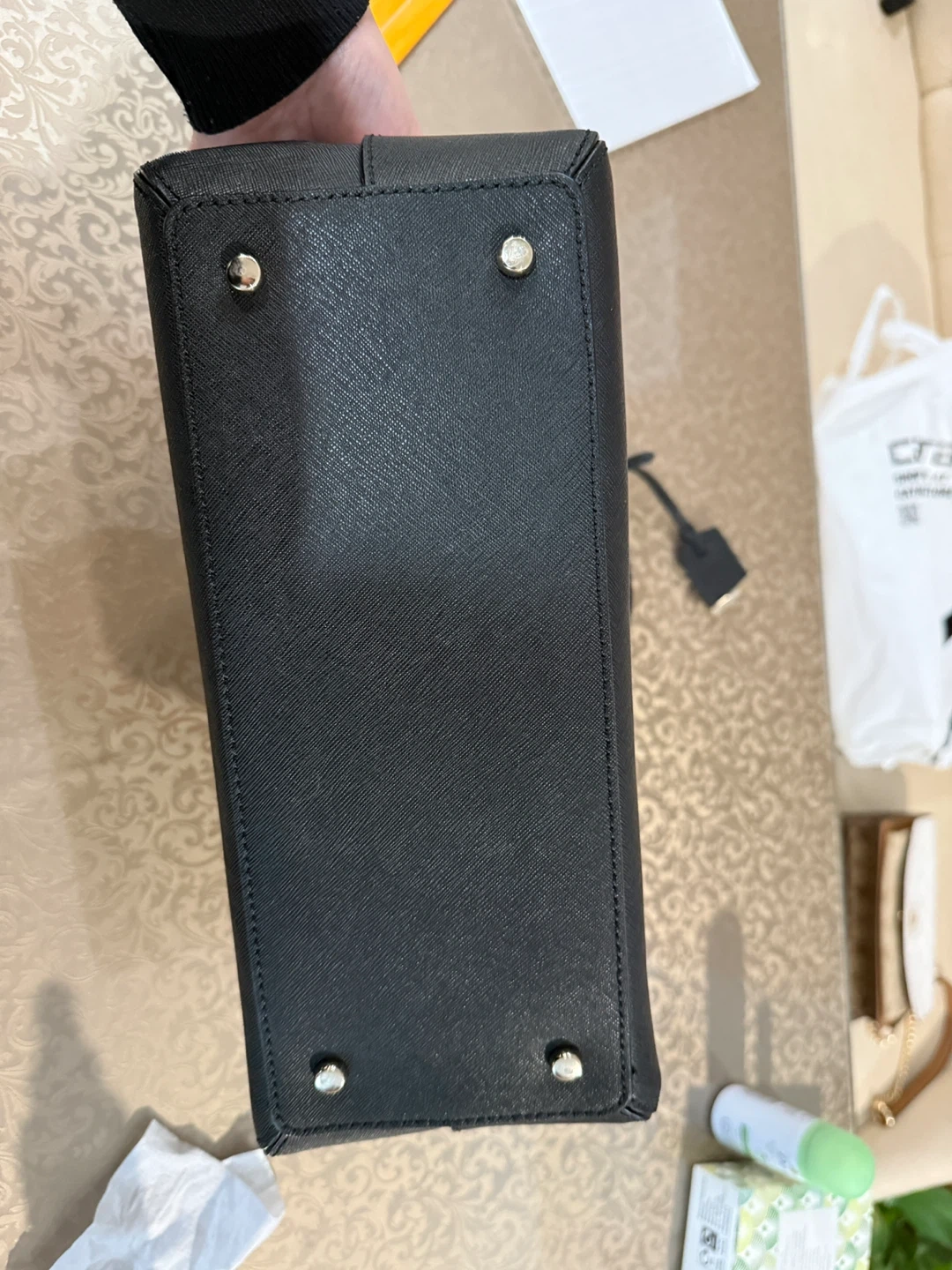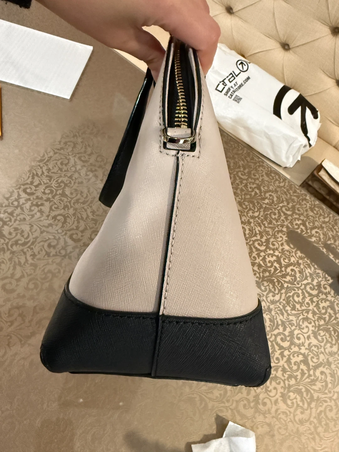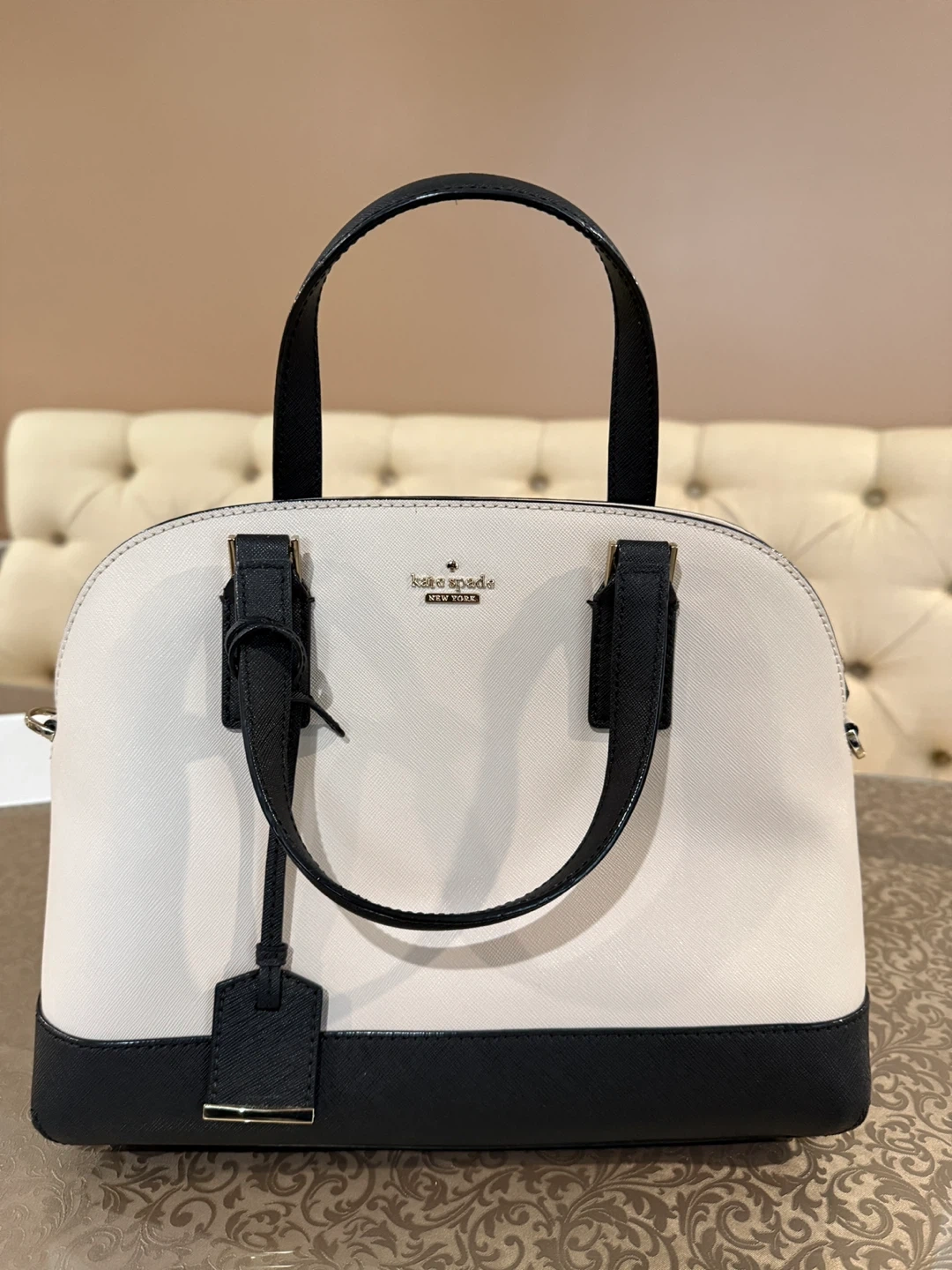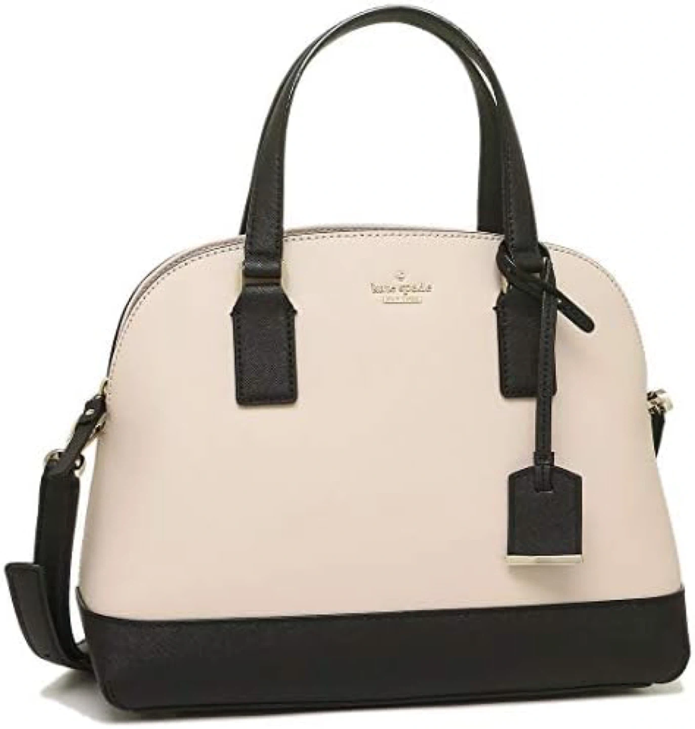 This is a Kate Spade New York dome satchel in cream and black. It features top handles and a detachable crossbody strap. It's a stylish and versatile handbag. Interior has striped lining with pockets.