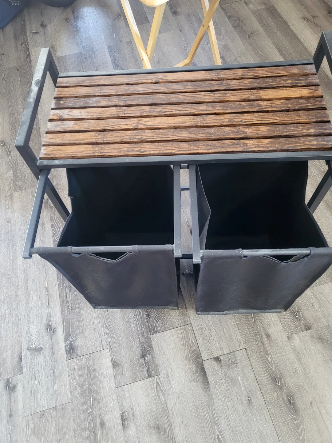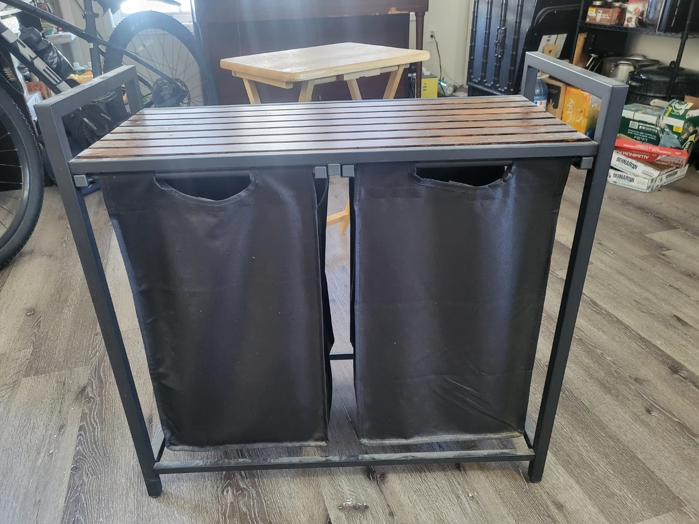 This double laundry hamper features a rustic wooden top and two black fabric bins. It's great for organizing laundry. The metal frame provides sturdy support for everyday use.