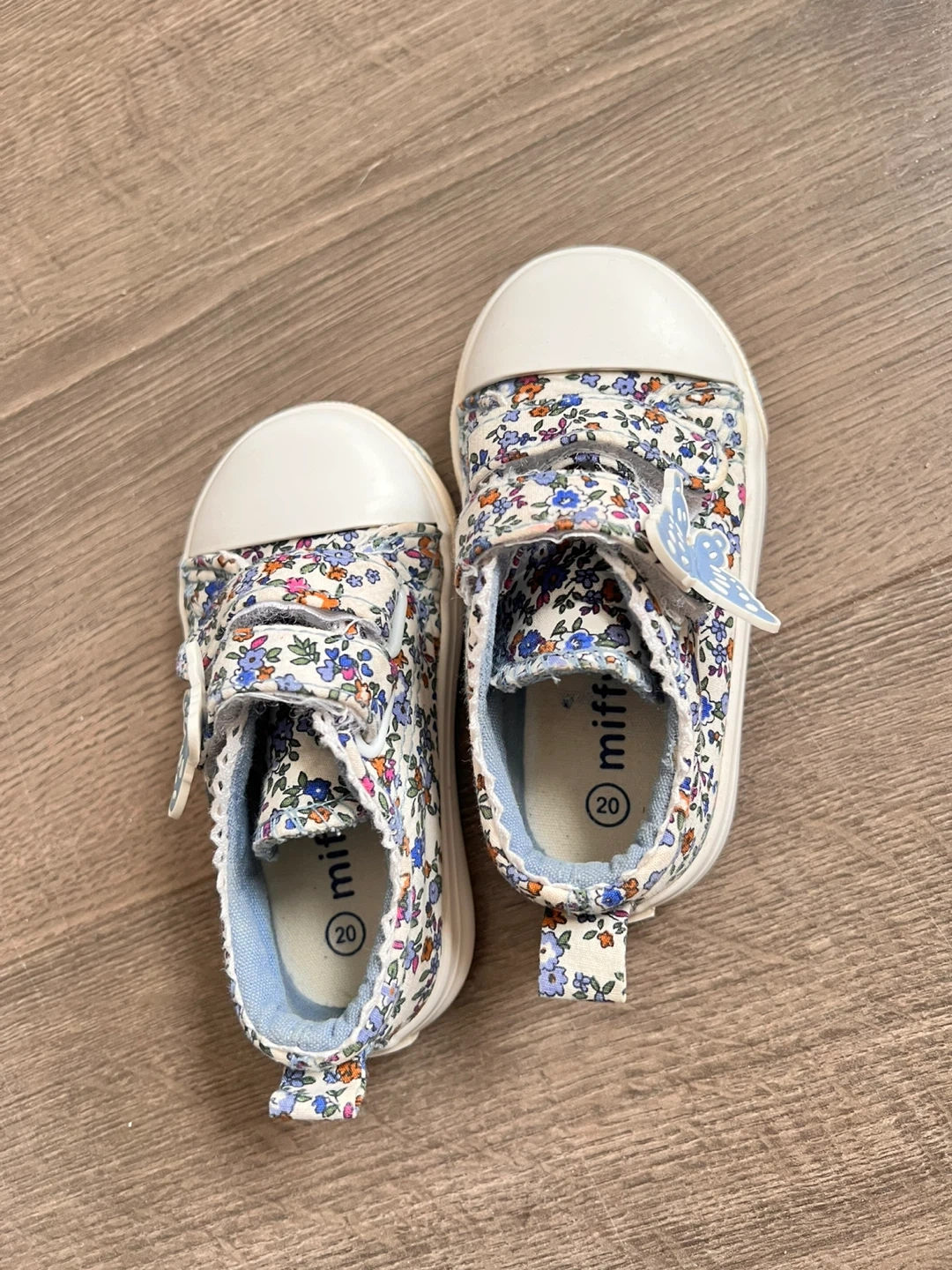 Cute Miffy brand toddler sneakers with a colourful floral print. They're size 5 with velcro closure and a sweet butterfly accent. Perfect for little ones learning to walk!