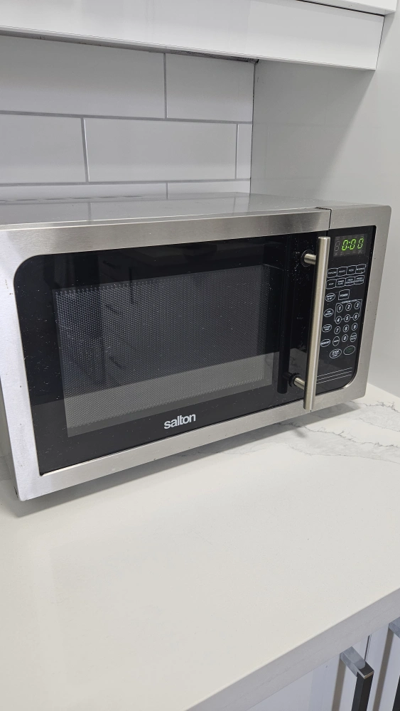 Stainless steel microwave. It includes a turntable and a digital display. It has several settings and features. It is in good working condition.