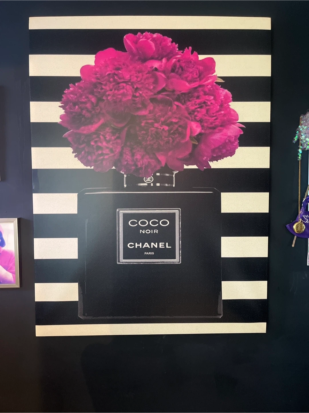 A striking piece of art featuring a Chanel Coco Noir perfume bottle with a beautiful floral arrangement on top. Great if you love the brand! It’s a very big picture width 351/2 inch X 471/2 inch