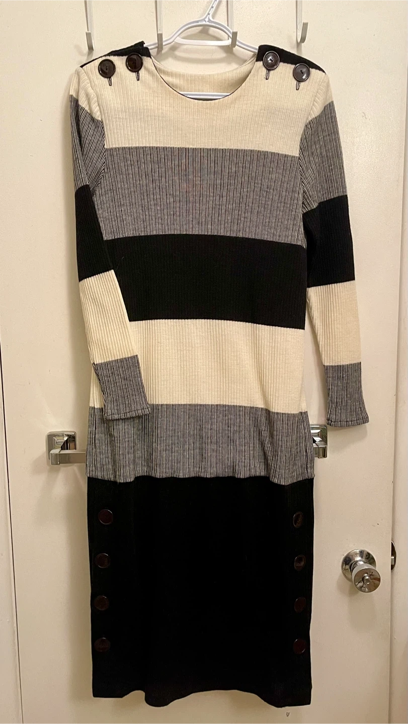 This rare vintage 1970s Mandy Designs Montreal sweater dress features a classic dark navy and cream stripe pattern. It has oversized button detailing down both sides of the skirt and on the shoulders and features a gauze lining for extra shapeliness. Fits size small or small/medium. Excellent vintage condition. From a smoke free, cat friendly home.
