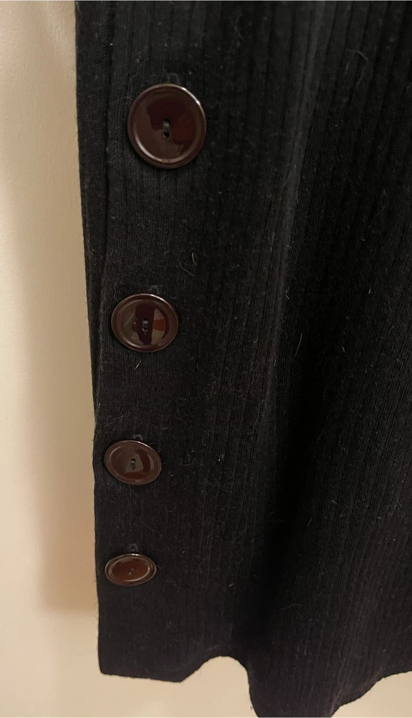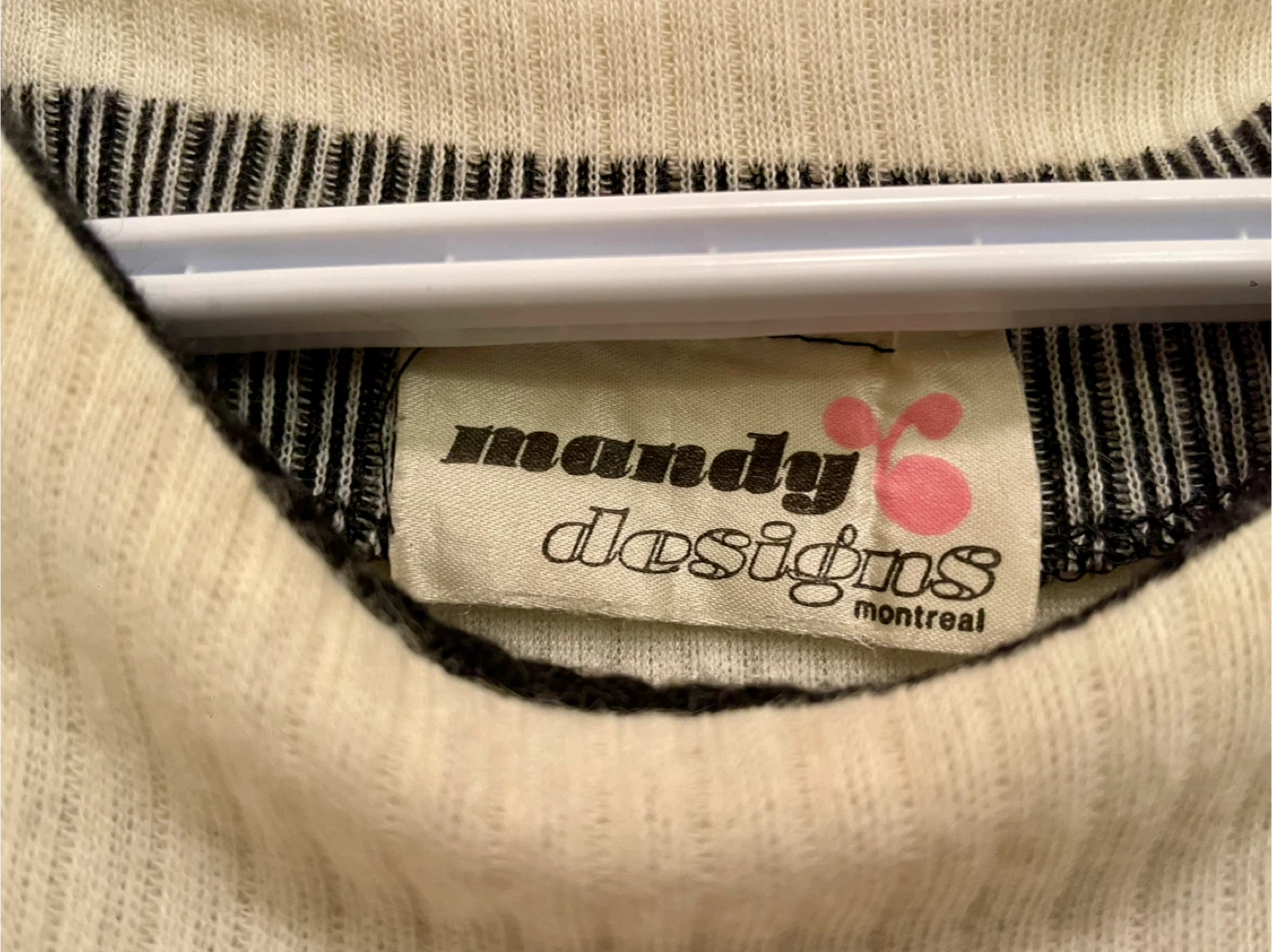 This rare vintage 1970s Mandy Designs Montreal sweater dress features a classic dark navy and cream stripe pattern. It has oversized button detailing down both sides of the skirt and on the shoulders and features a gauze lining for extra shapeliness. Fits size small or small/medium. Excellent vintage condition. From a smoke free, cat friendly home.