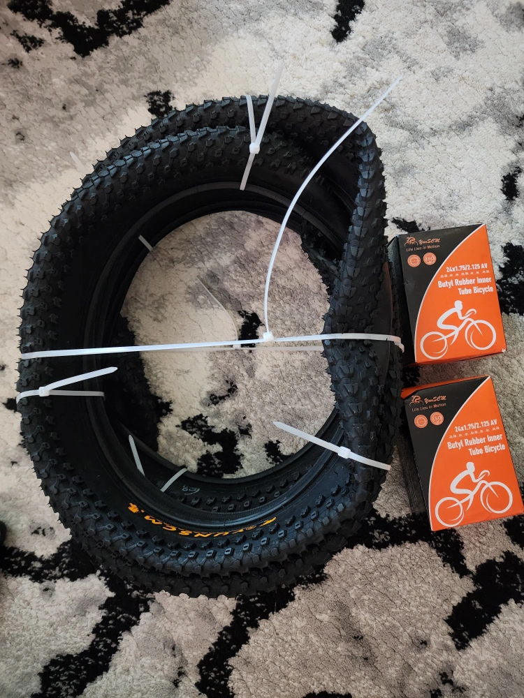 Selling a set of YUNSCM bicycle tires. - Size: 24 x 1.75/2.125 AV - Includes butyl rubber inner tubes - Dimensions: 27.7 x 15.2 x 34.9 cm Ready for your next cycling adventure!
