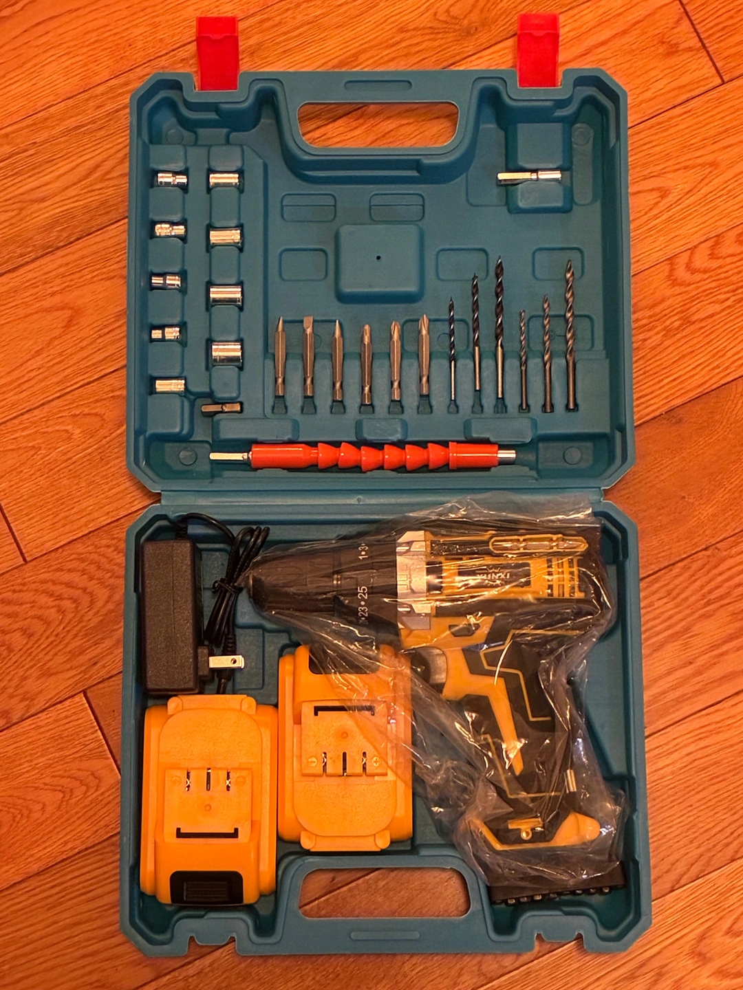 5YUNXI Lithium Electric Drill Set with 2 Li-Ion Batteries, and with carrying case, new Includes two new li-ion batteries max 21V, and over 26 accessories, all neatly organized in a carrying case. Original price: $100 CAD Now only $70 CAD