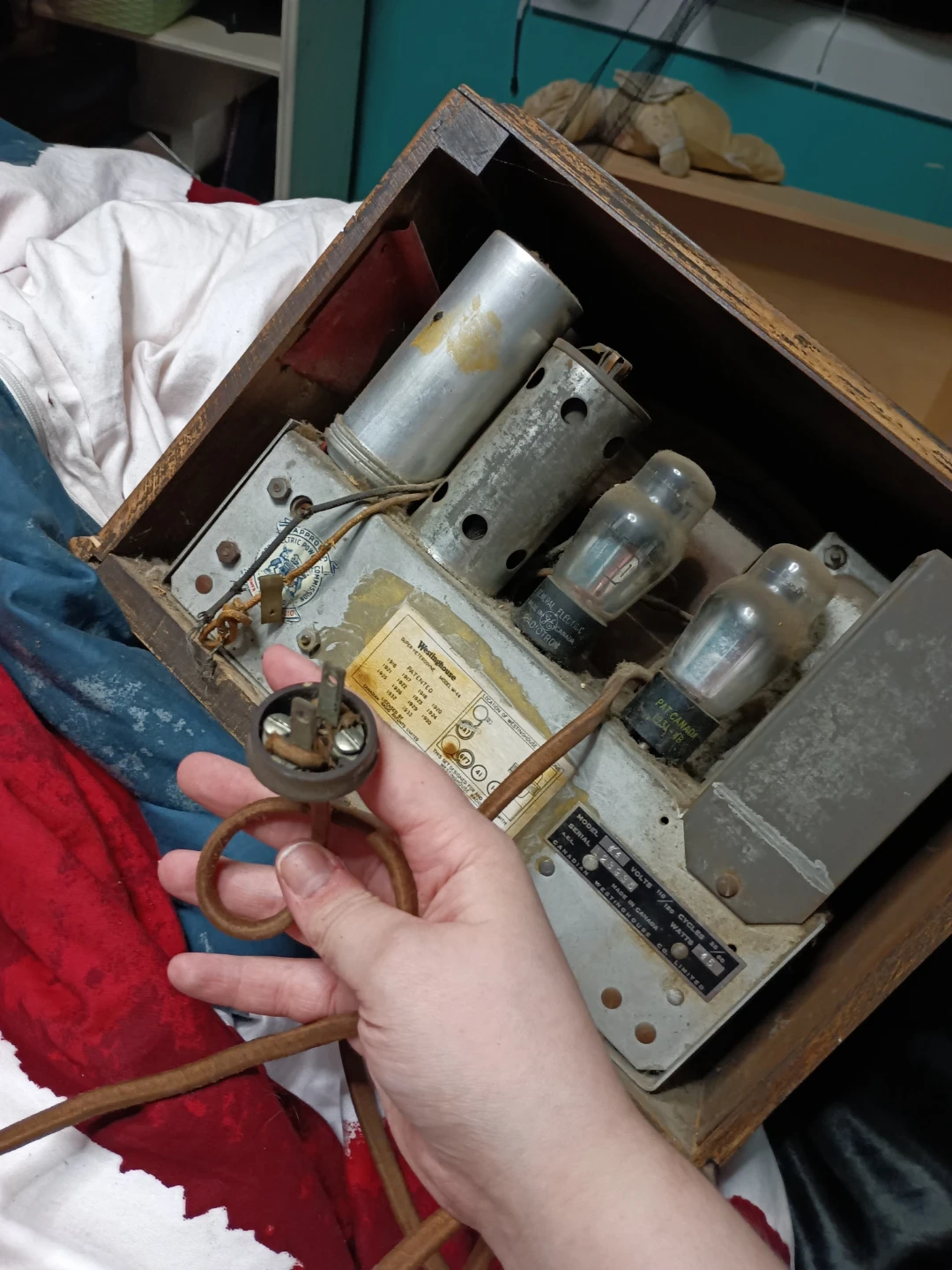 This is a vintage Westinghouse tube radio. It features a classic art deco style front. It looks like it's missing a knob. This radio would be great for a collector or for someone looking to restore an antique piece.