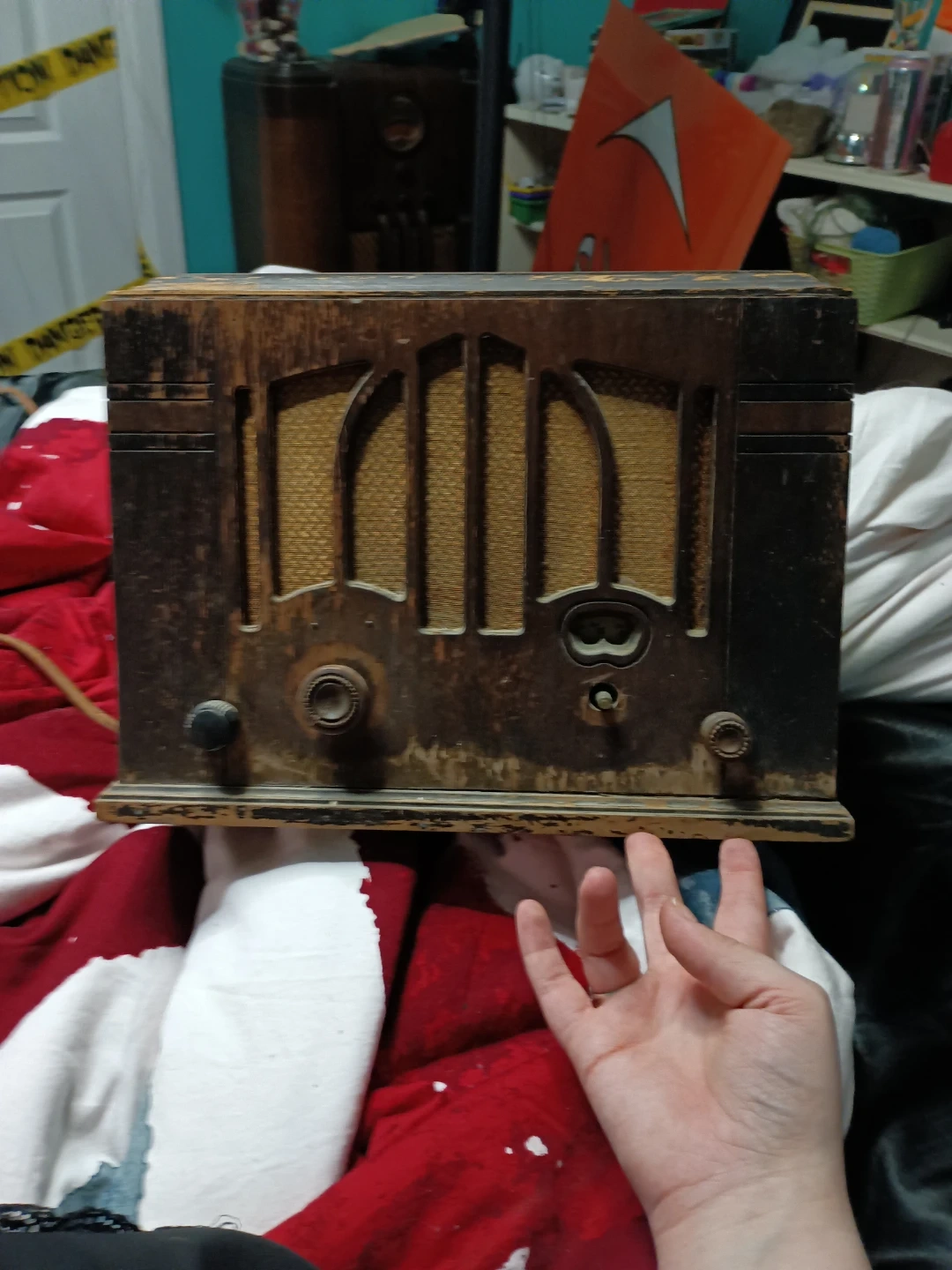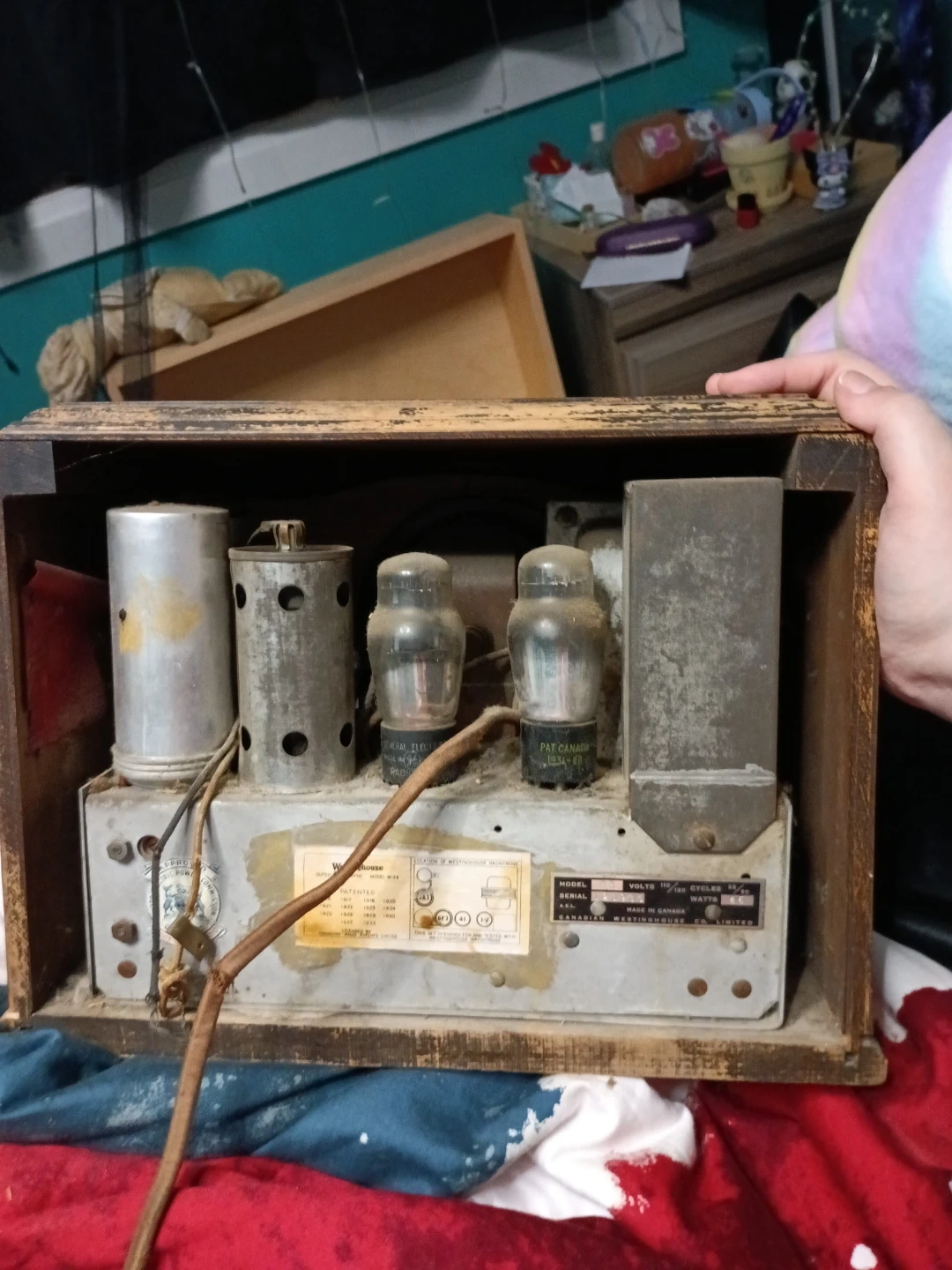 This is a vintage Westinghouse tube radio. It features a classic art deco style front. It looks like it's missing a knob. This radio would be great for a collector or for someone looking to restore an antique piece.