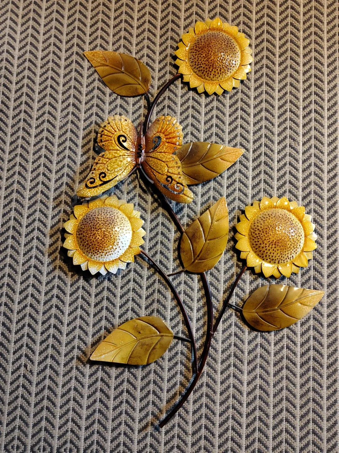 This metal wall art features sunflowers and a butterfly. It's made of metal and has a lovely painted finish. It's great for adding a touch of nature to your decor!