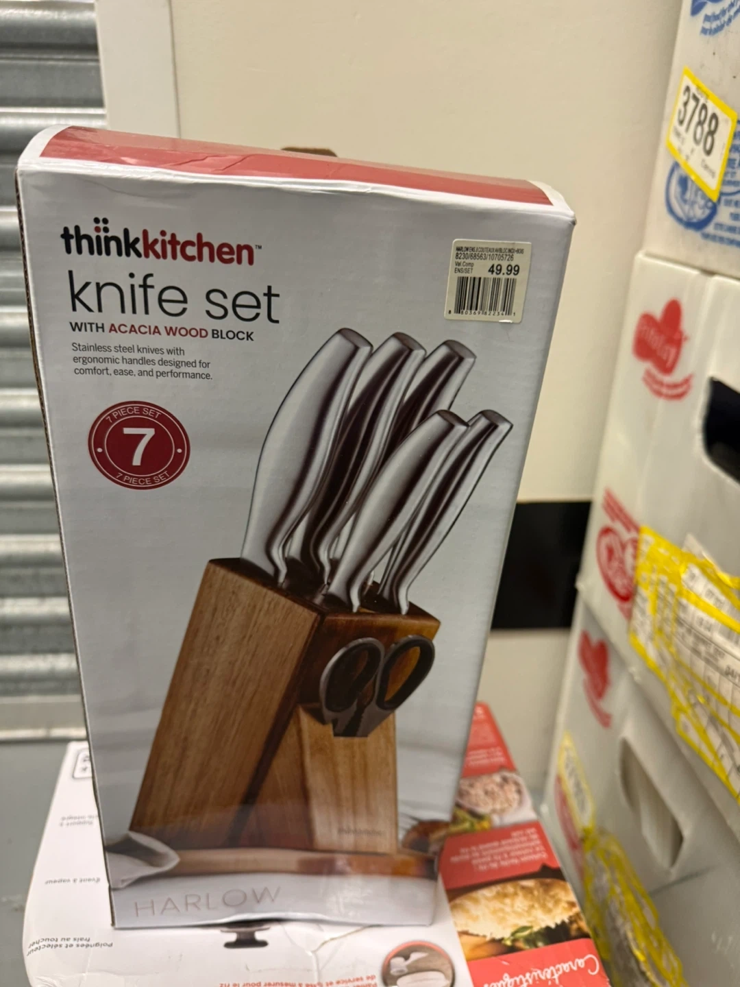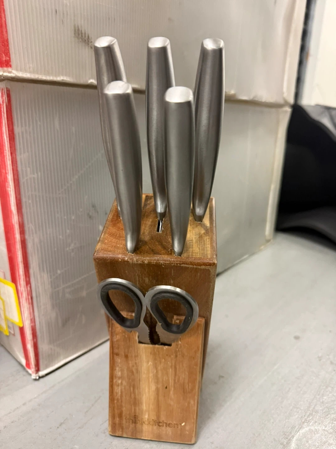 This thinkkitchen knife set includes seven pieces, all housed in an acacia wood block. Knives feature stainless steel blades and ergonomic handles. It also comes with a pair of scissors in the block.