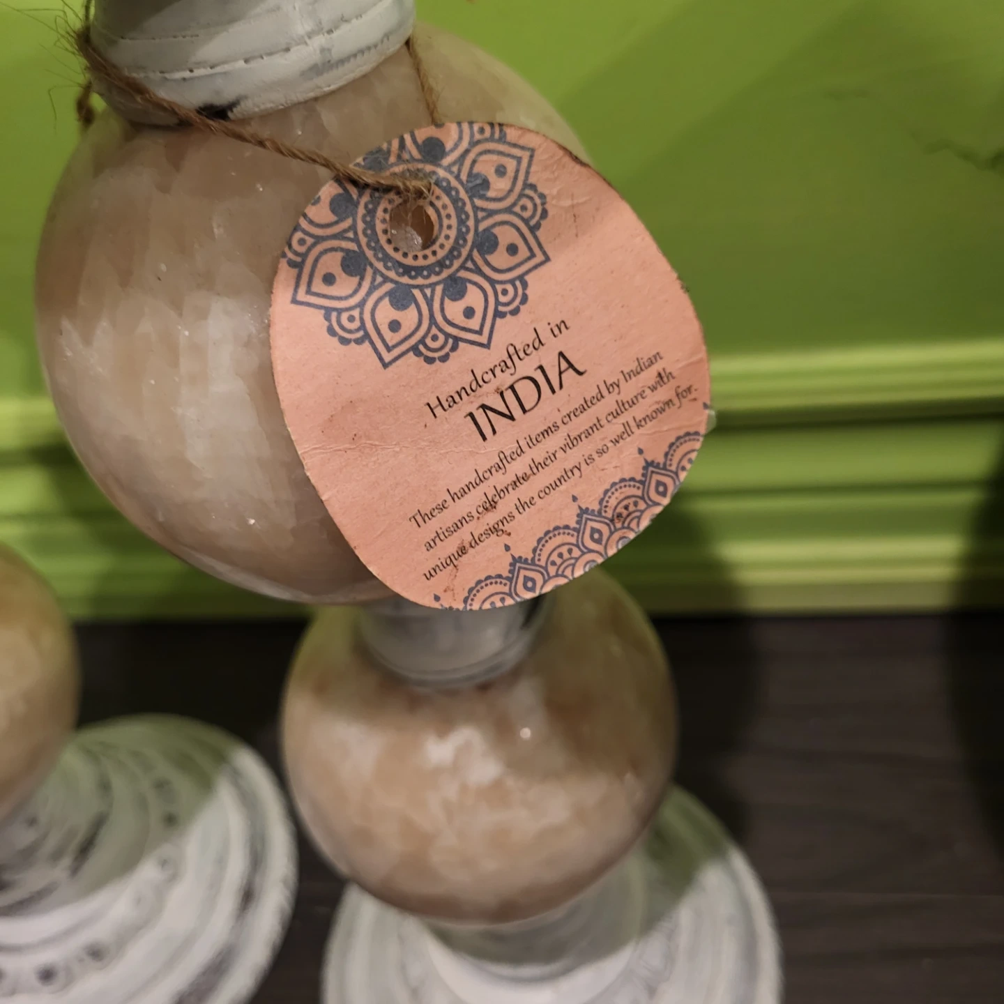 Set of two decorative candle holders. Handcrafted in India with stone spheres and a distressed white base. Perfect for adding a touch of elegance to any room!