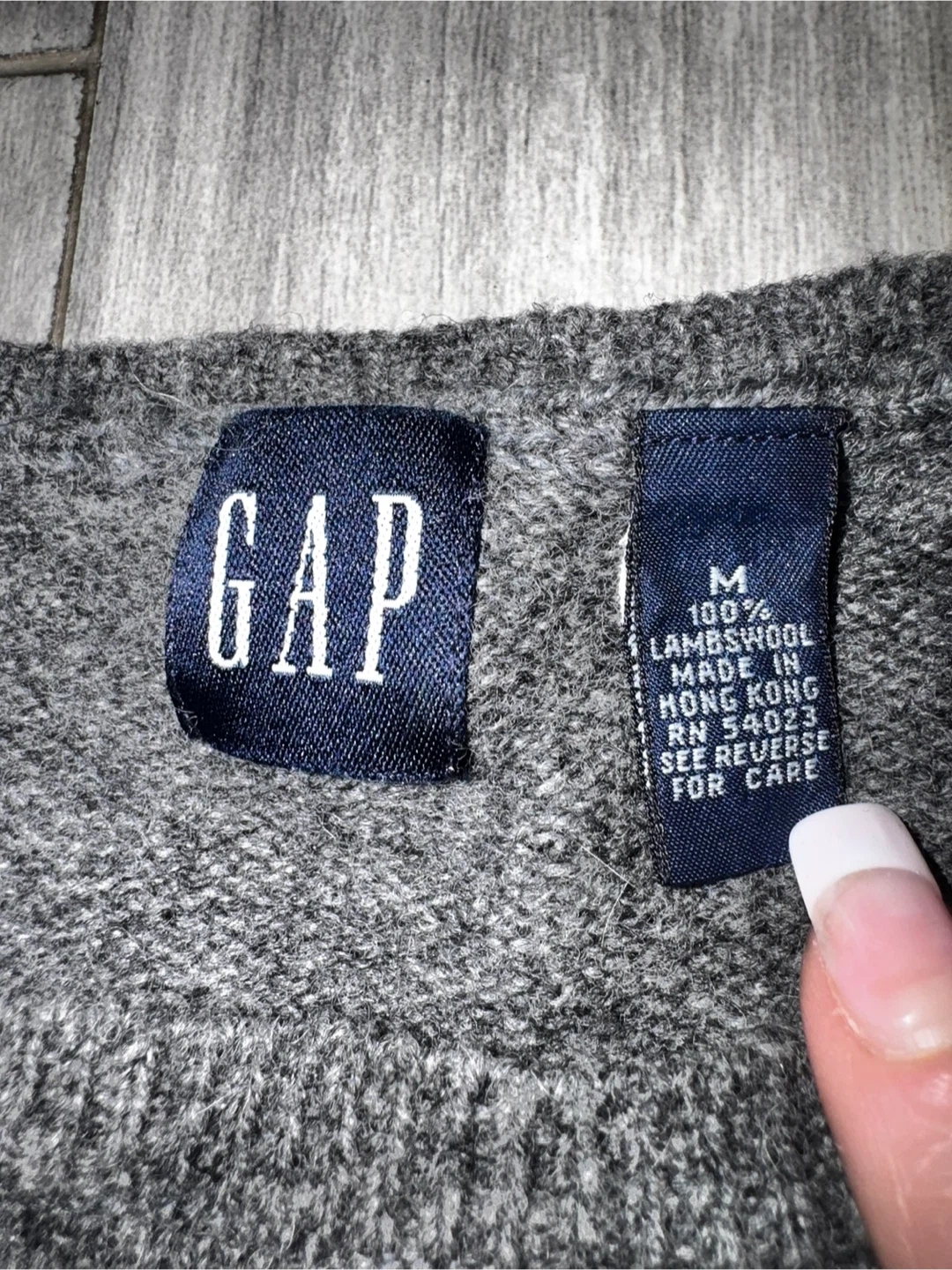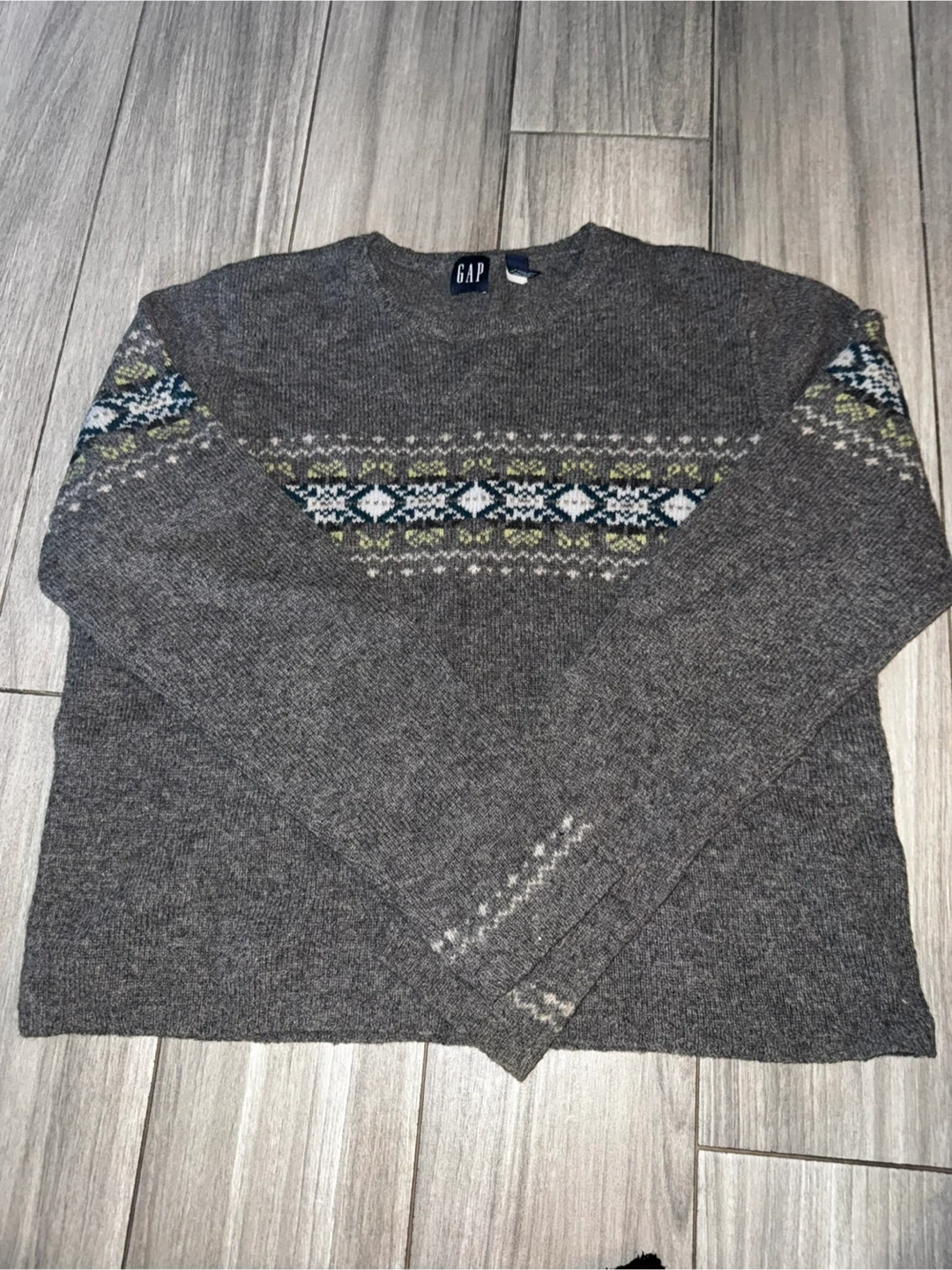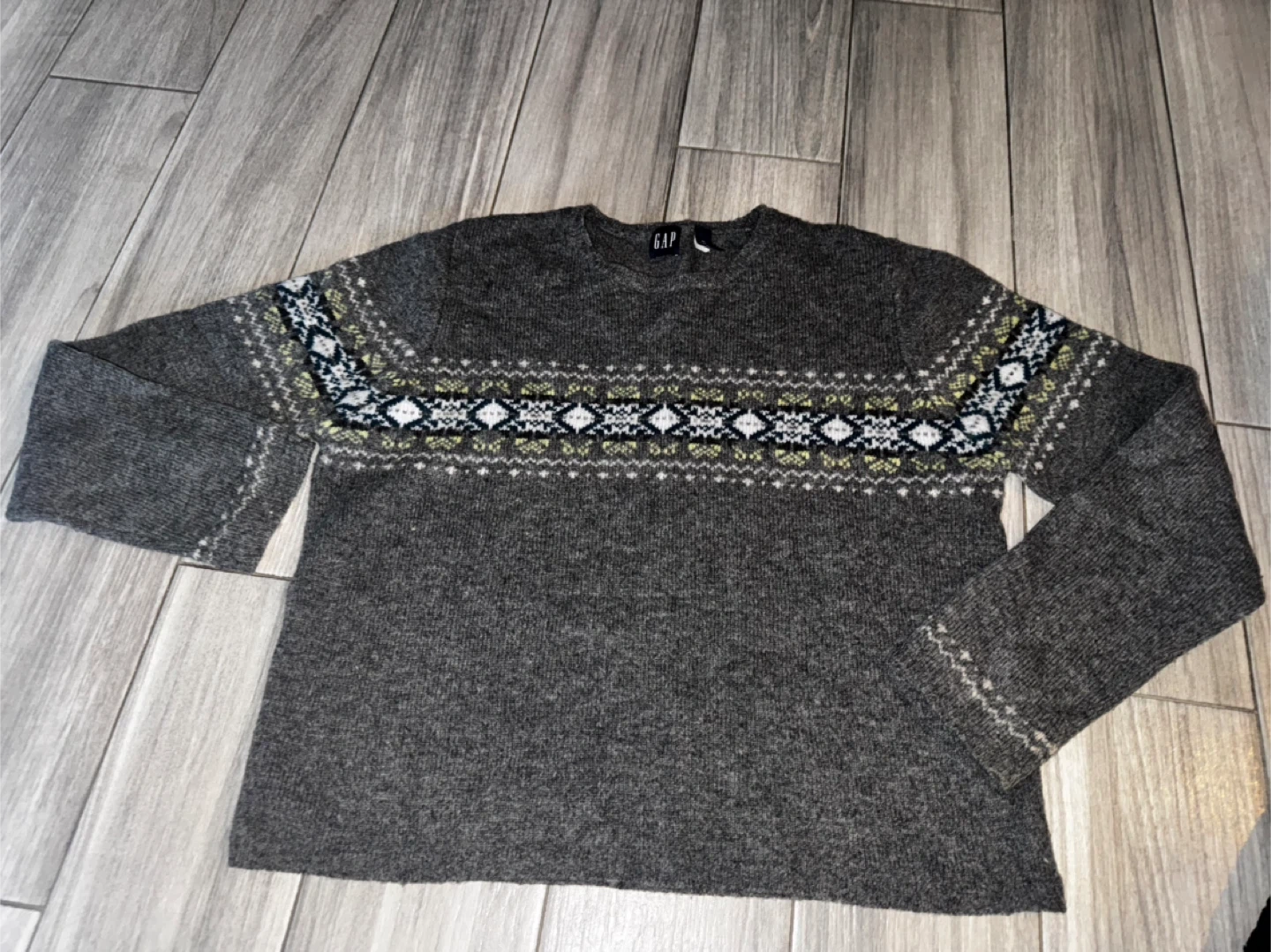 This is a GAP men's sweater with a classic Fair Isle pattern. It's made from 100% lambswool. The sweater is a size medium and features a grey base with a colorful geometric design across the chest and sleeves. Great for cooler weather!