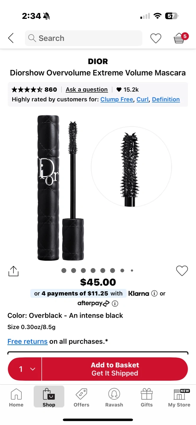 DIOR Diorshow Overvolume Extreme Volume Mascara. It's an intense black shade, offering 24H extreme volume. Net weight 0.30 oz/8.5g.