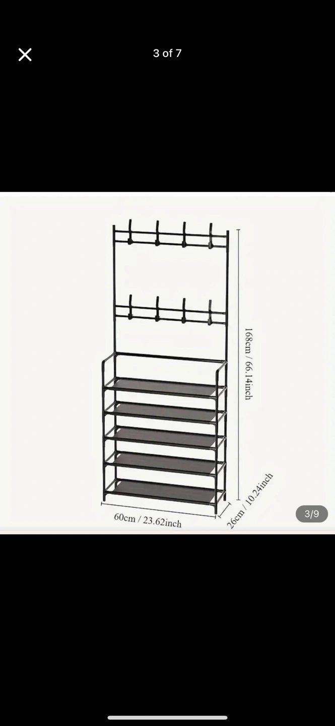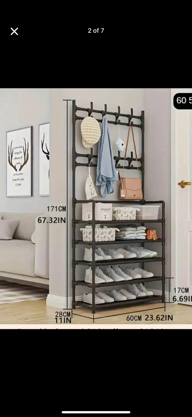 New in box. Multifunctional storage unit. Features a coat rack, multiple shoe shelves, and sturdy metal frame. Washable polyester fabric shelves. Great for entryway organization.