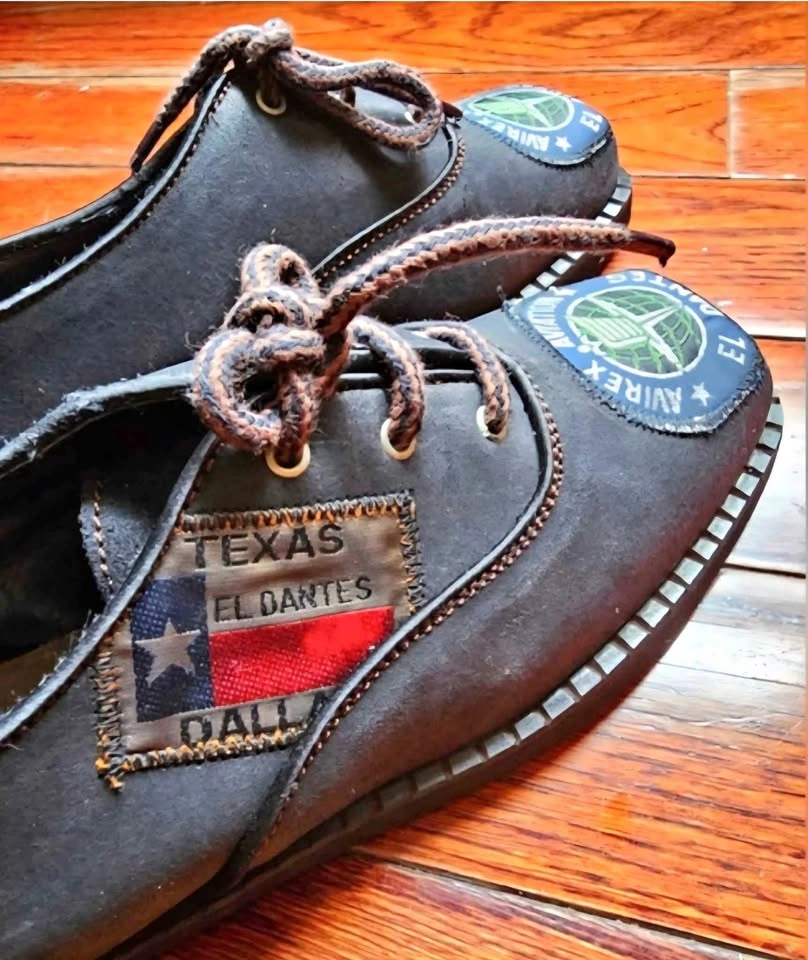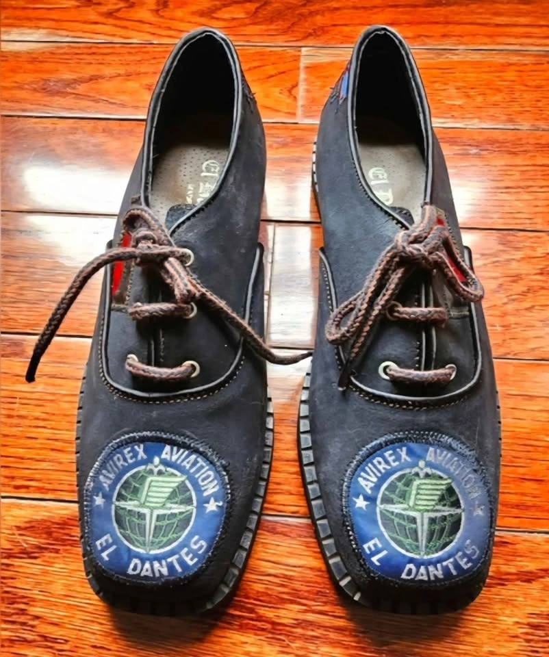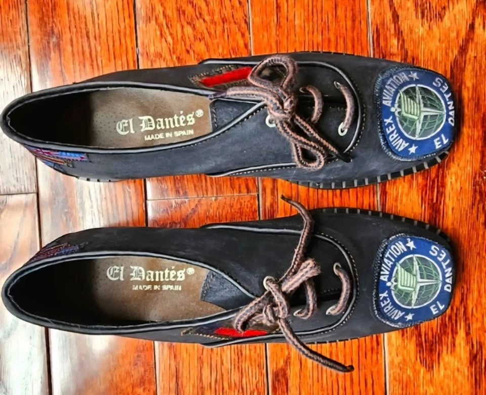 Unique and eye-catching vintage black suede leather shoes from El Dantes, made in Spain. These are deadstock and in like new condition. There is a bit of scuffing to the uppers from bumping around in storage but the soles show no wear. These shoes feature patches all over that have UK and US national flags, a Dallas Texas logo, and an Avirex Aviation logo for a retro flair.