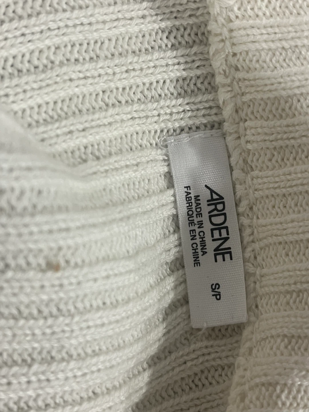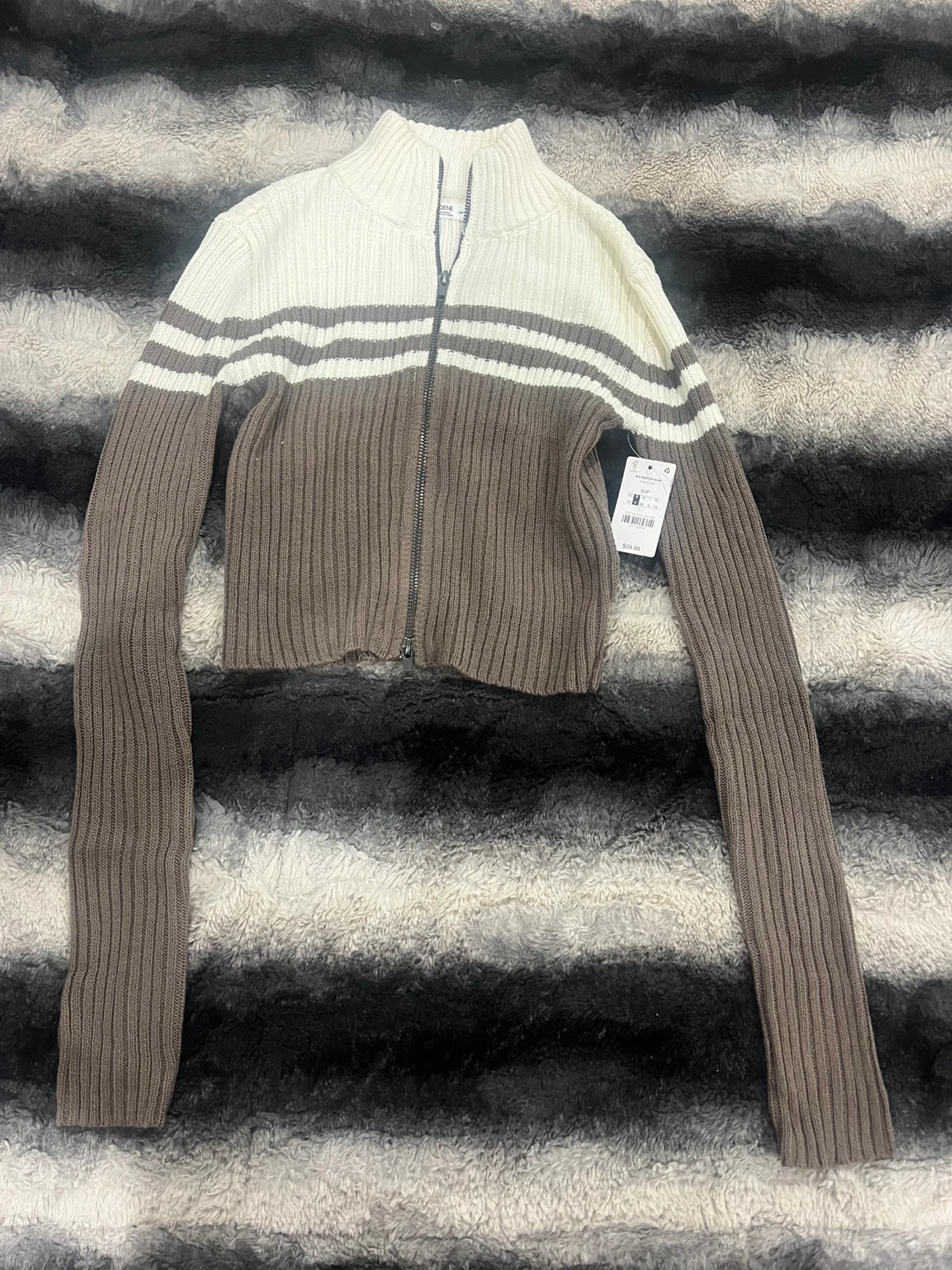 This ARDENE sweater is a size Small. It's a cropped style with a mock neck and has long sleeves. The sweater has a white top section with brown sleeves and a brown bottom section, with horizontal stripes. The sweater is made of 60% cotton and 40% acrylic.
