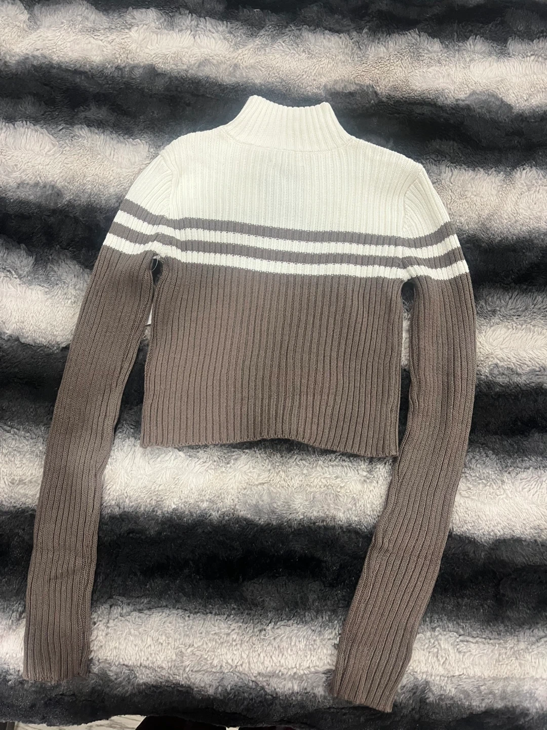 This ARDENE sweater is a size Small. It's a cropped style with a mock neck and has long sleeves. The sweater has a white top section with brown sleeves and a brown bottom section, with horizontal stripes. The sweater is made of 60% cotton and 40% acrylic.