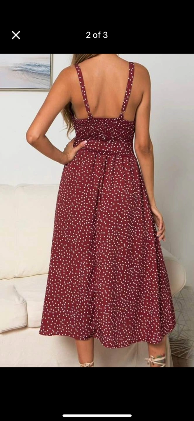 Red dress with white polka dots! It has a smocked bodice and button-down front with a tie at the waist. The material is lightweight and perfect for summer days! ***Pick up at