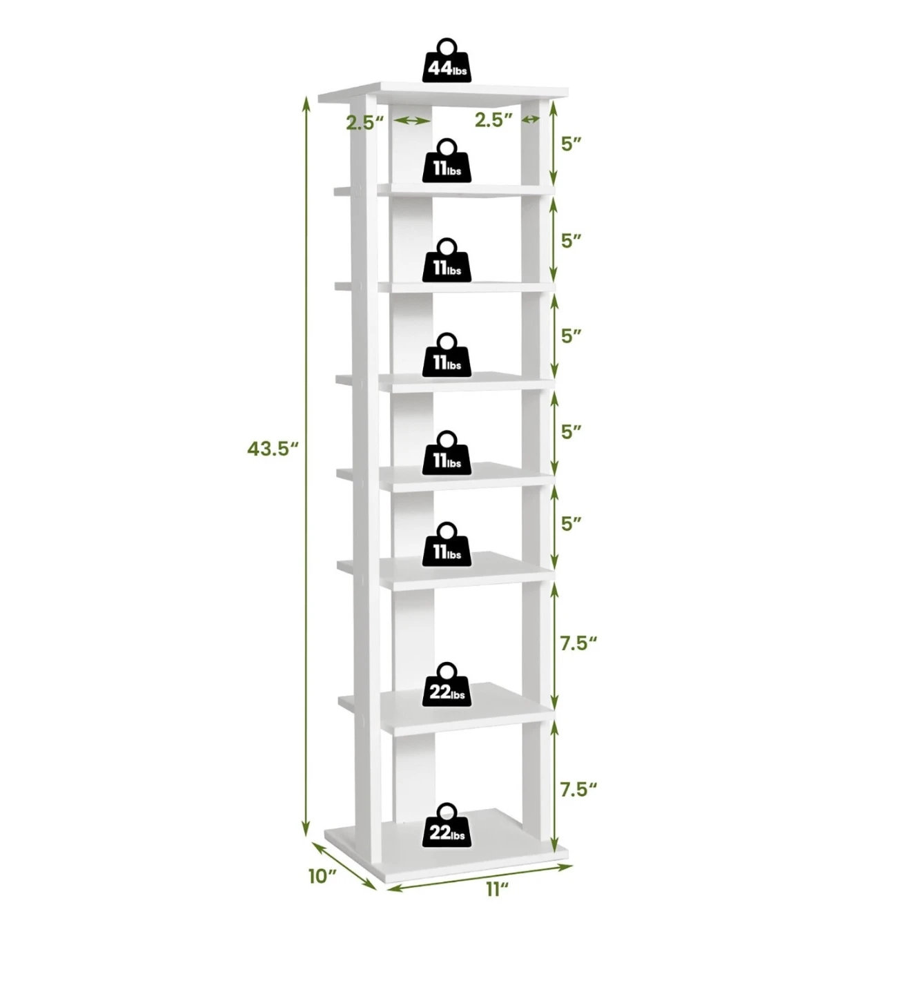 Selling a versatile 7-tier rack that can be used for shoes, plants, or as a storage unit! It's white and measures approximately 43.5 inches tall, 11 inches wide, and 10 inches deep. Each shelf can hold up to 11 lbs, with the bottom two shelves supporting up to 22 lbs each