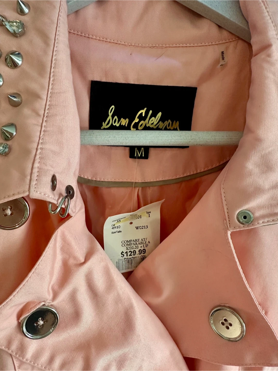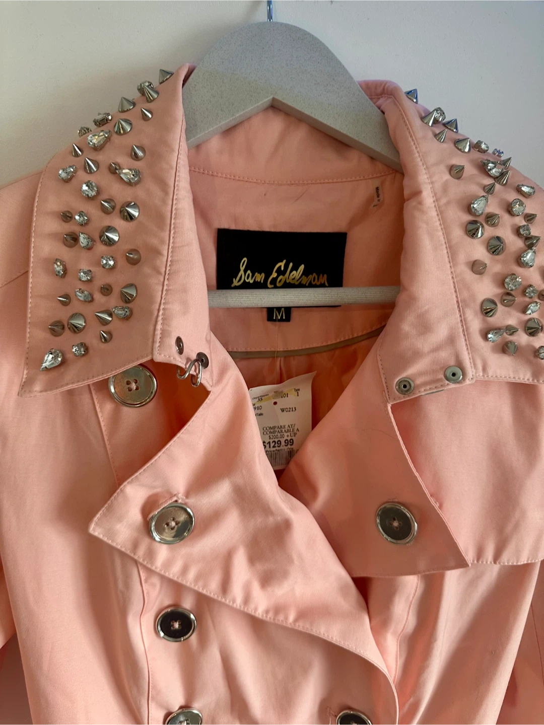 NNW Selling a Sam Edelman trench coat in a lovely pink colour! It's a size medium and features unique stud detailing on the collar. The coat also has a belt to cinch the waist. Originally bought for $129.99!